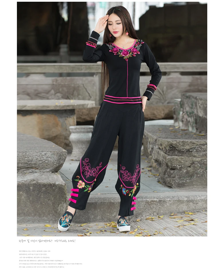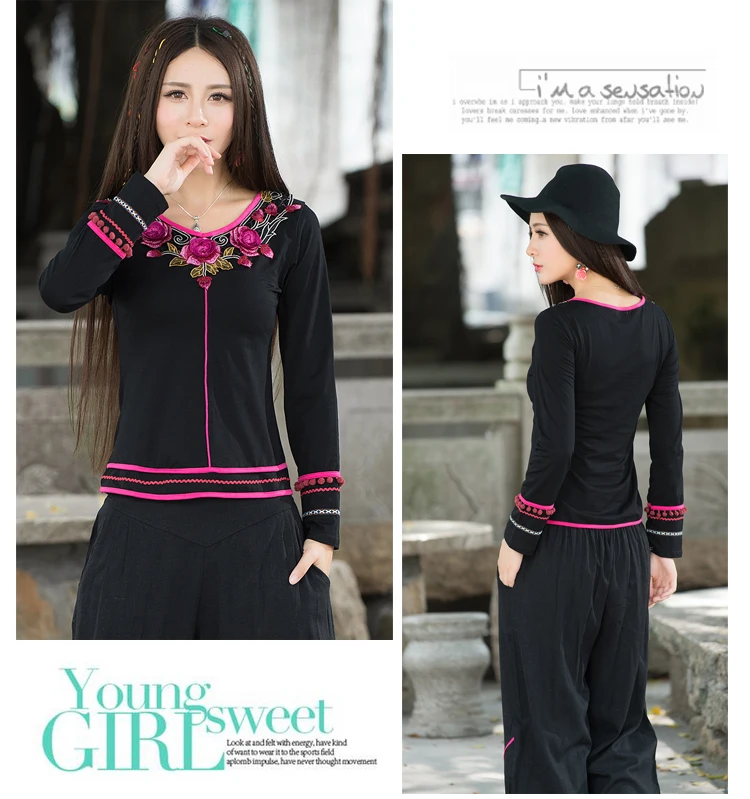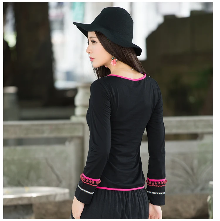 Camisas femininas Женский Пуловер женский винтажный 70 s этнический мексиканский стиль длинный рукав v-образный вырез черная футболка с вышивкой AF498