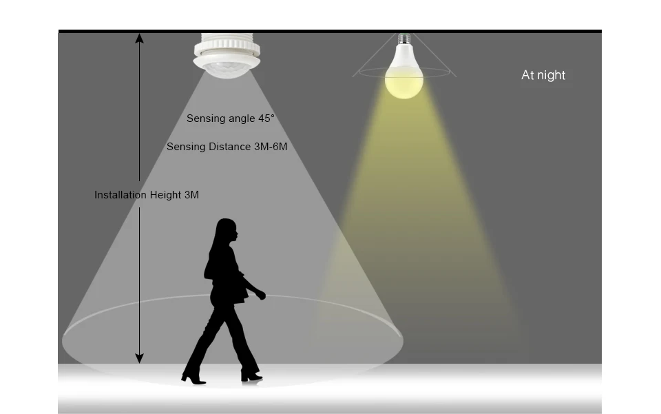 1. Режим зондирования: Датчик PIR + светильник 2. Номинальное напряжение: 220 В 50 Гц 3. Выход: контролируемый кремний 4. Мощность нагрузки: лампа накаливания ≤100 Вт Экономии электроэнергии лампа ≤30W LED≤18W 6. Расстояние срабатывания: 3-6 м (высокая температура повлияет на чувствительность переключателя) 7. Угол срабатывания: 110 ° 8. Чувствительность к светильник: затемнение