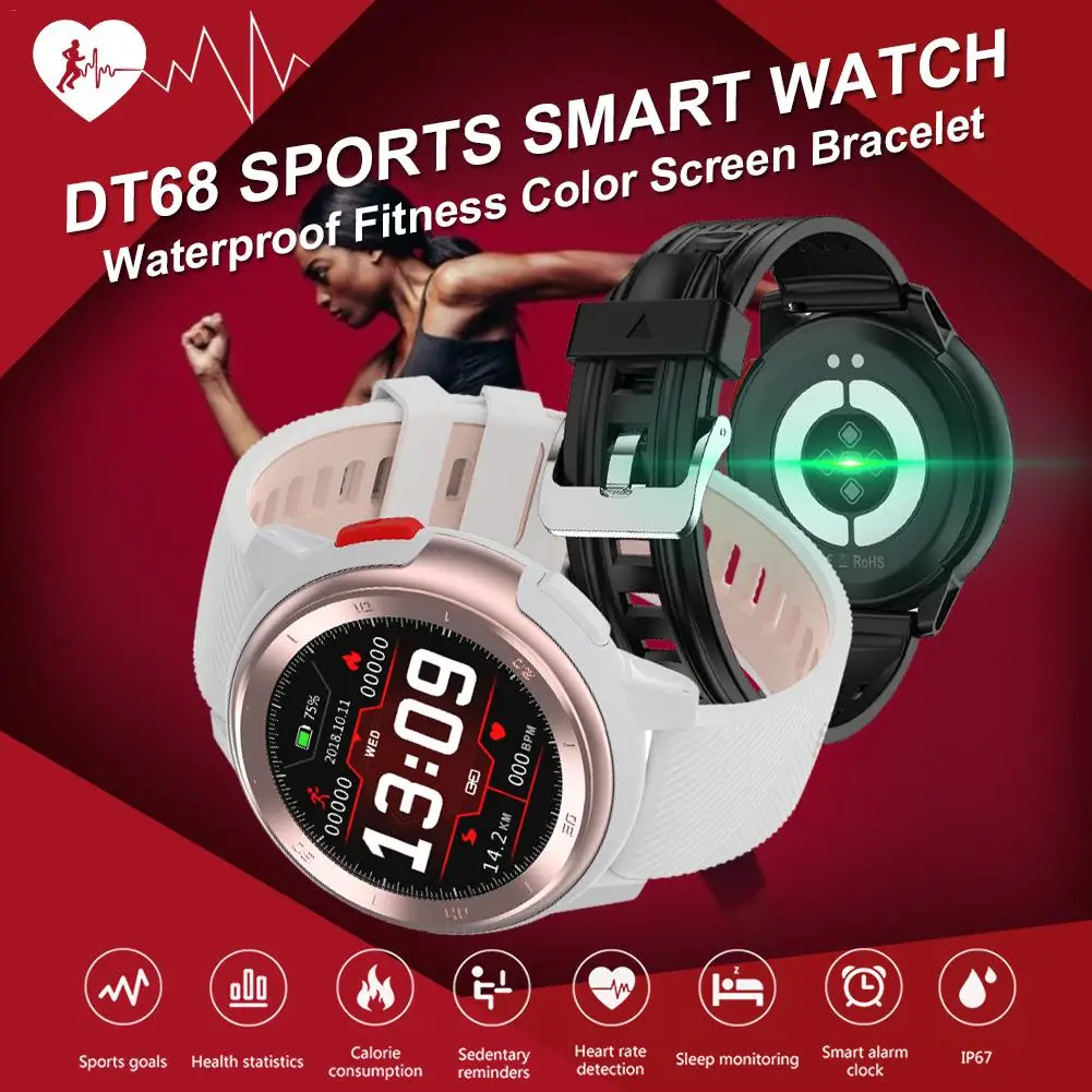 Model: DT68 Sports Smart WatchCompatible systems: for IOS and AndroidFunction: Large memory and low-power watch, 20 dials, heart rate monitoring, ECG monitoring, blood pressure monitoring, blood oxygen monitoring, motion monitoring, weather display, step counting, stopwatch, remote shooting, music control, fast payment (Alipay) and with a double strapApp support languages: Russian, Turkish, Hebrew, German, Italian, Japanese, French, Polish, Thai, Simplified Chinese, Translated Chinese, English, Portuguese, Spanish and ArabicDevice support languages: German, Russian, French, Japanese, Spanish, Italian, English, Portuguese, Arabic, Thai and ChineseAPP: fundoChip: Nordic NRF52832 (512Kb + 128Kb)Bluetooth: 4.2Waterproof level: IP68Process: zinc alloy and PC plasticNet weight: about 59gScreen size: 1.2 full round screenScreen resolution: 240*240Screen type: TFT color screenScreen material: tempered glassWristband material: two-color TPU strap and come with a single TPU strapBattery type: lithium batteryBattery model: 492428Battery voltage: 3.7VBattery capacity: 230mAhLife time: 7-10 days for normal connection, 30 days for standby. (Connected for personal use)Charging method: magneticCharging time: about 2 hoursWristband color: black red and platinumCertification: FCC ID, CE, ROHS and battery certification Packing List: