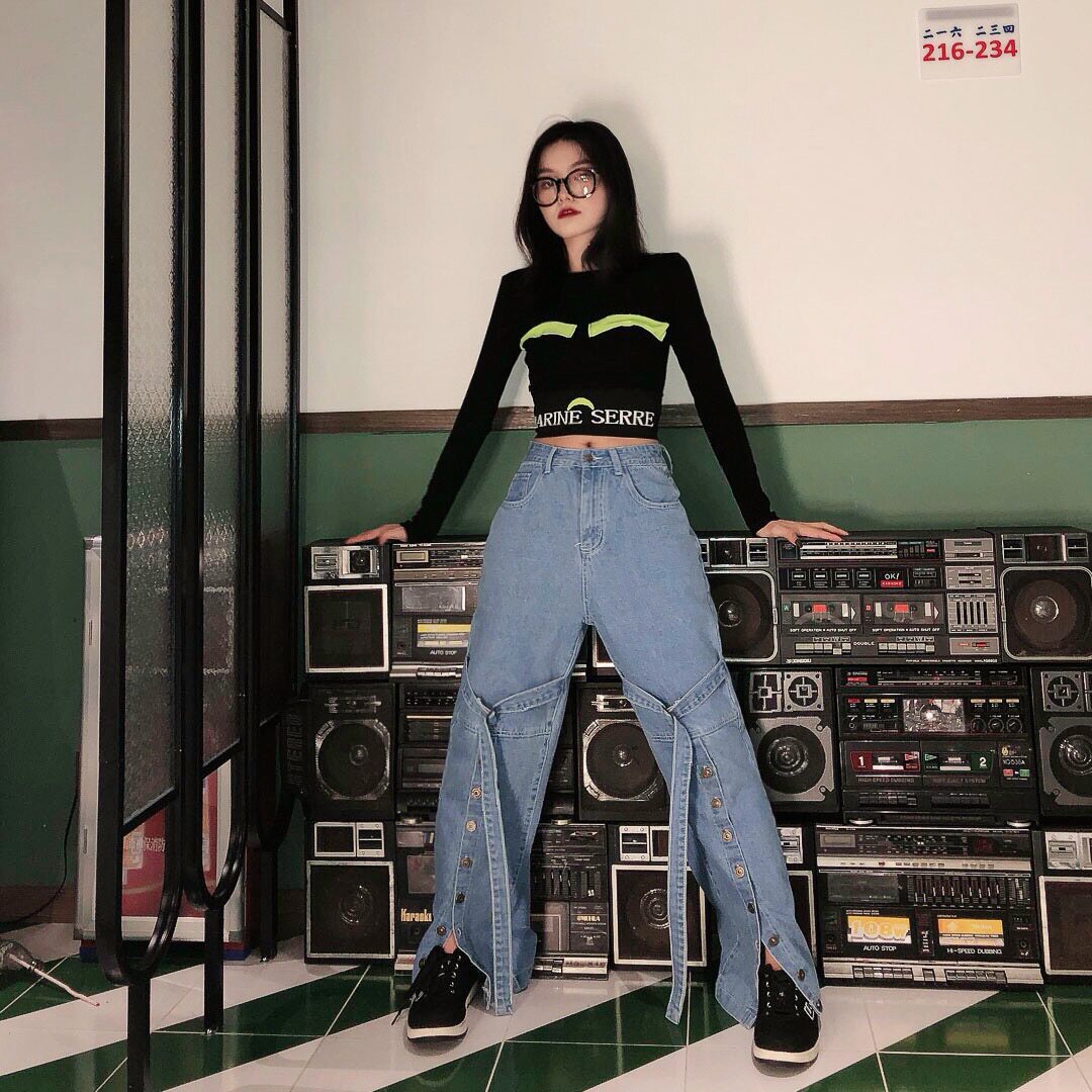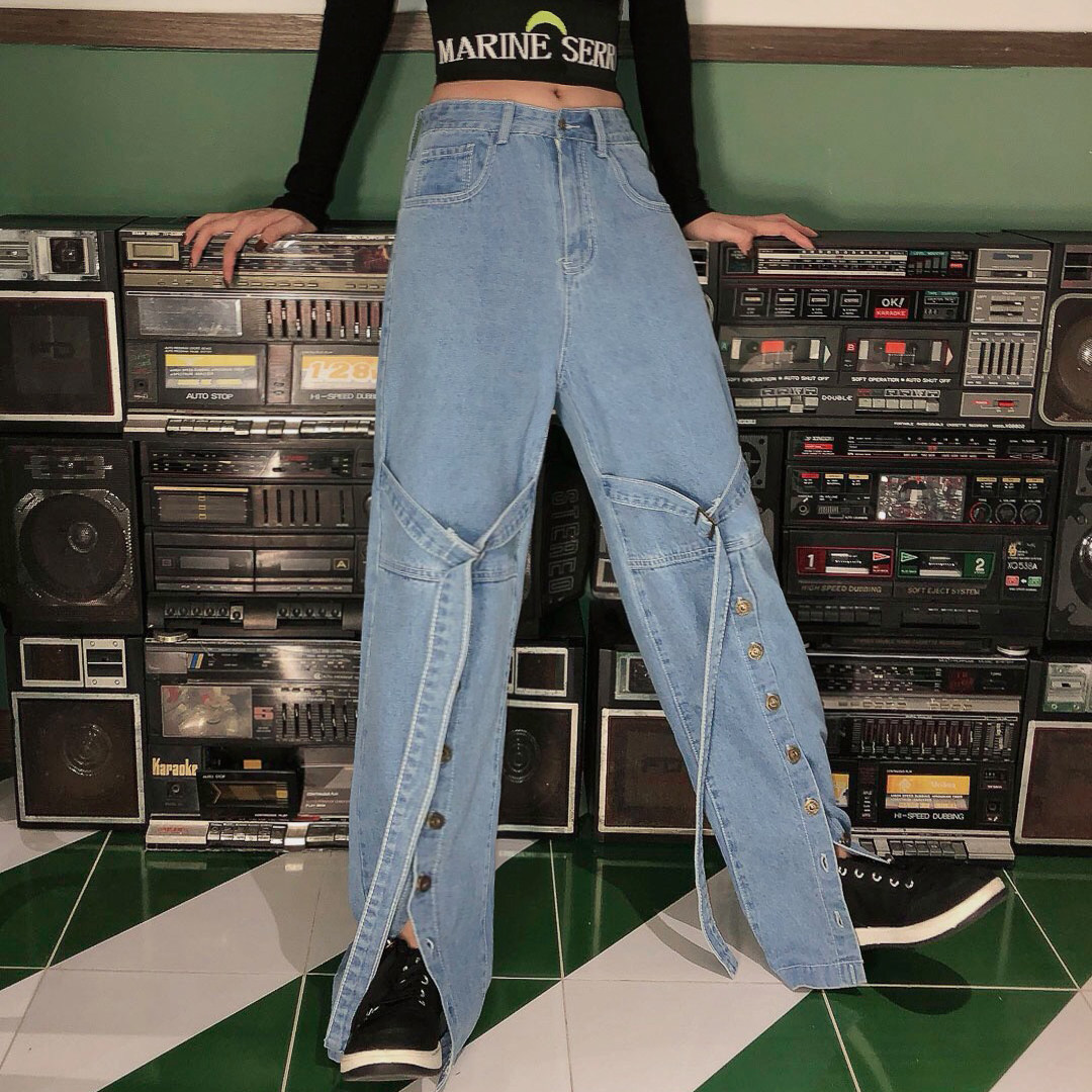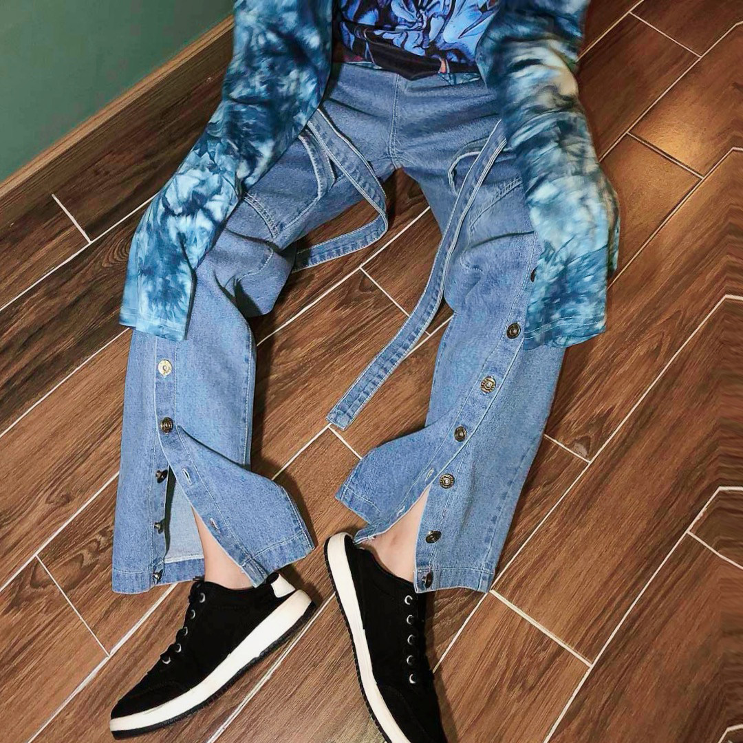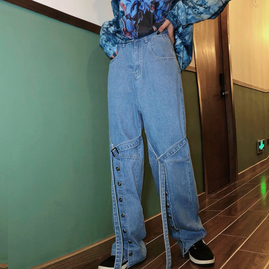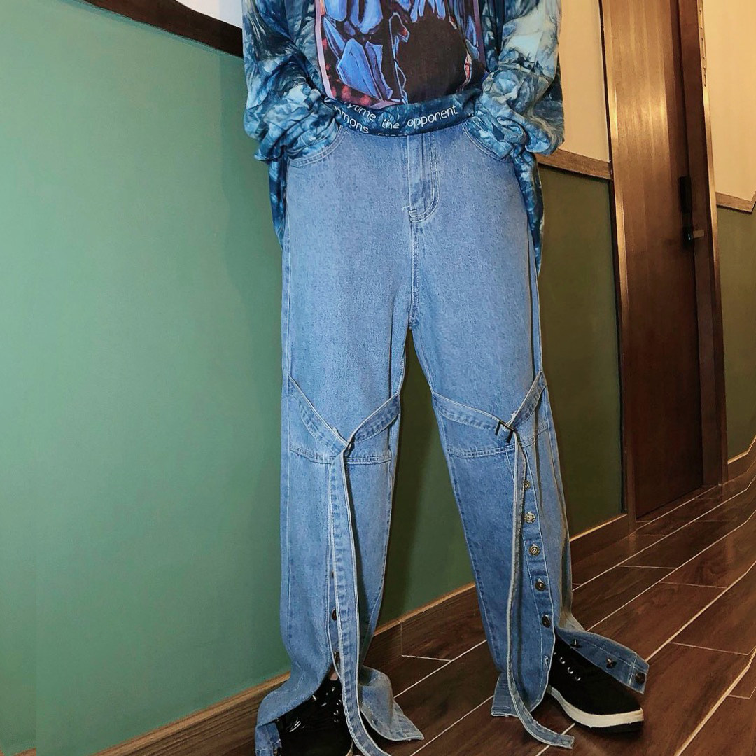 款名 | 拼接织带大开叉个性牛仔裤 | 颜色 | 蓝色 | 面料 | 洗水牛仔棉料 | 品牌 | JASUMMER |