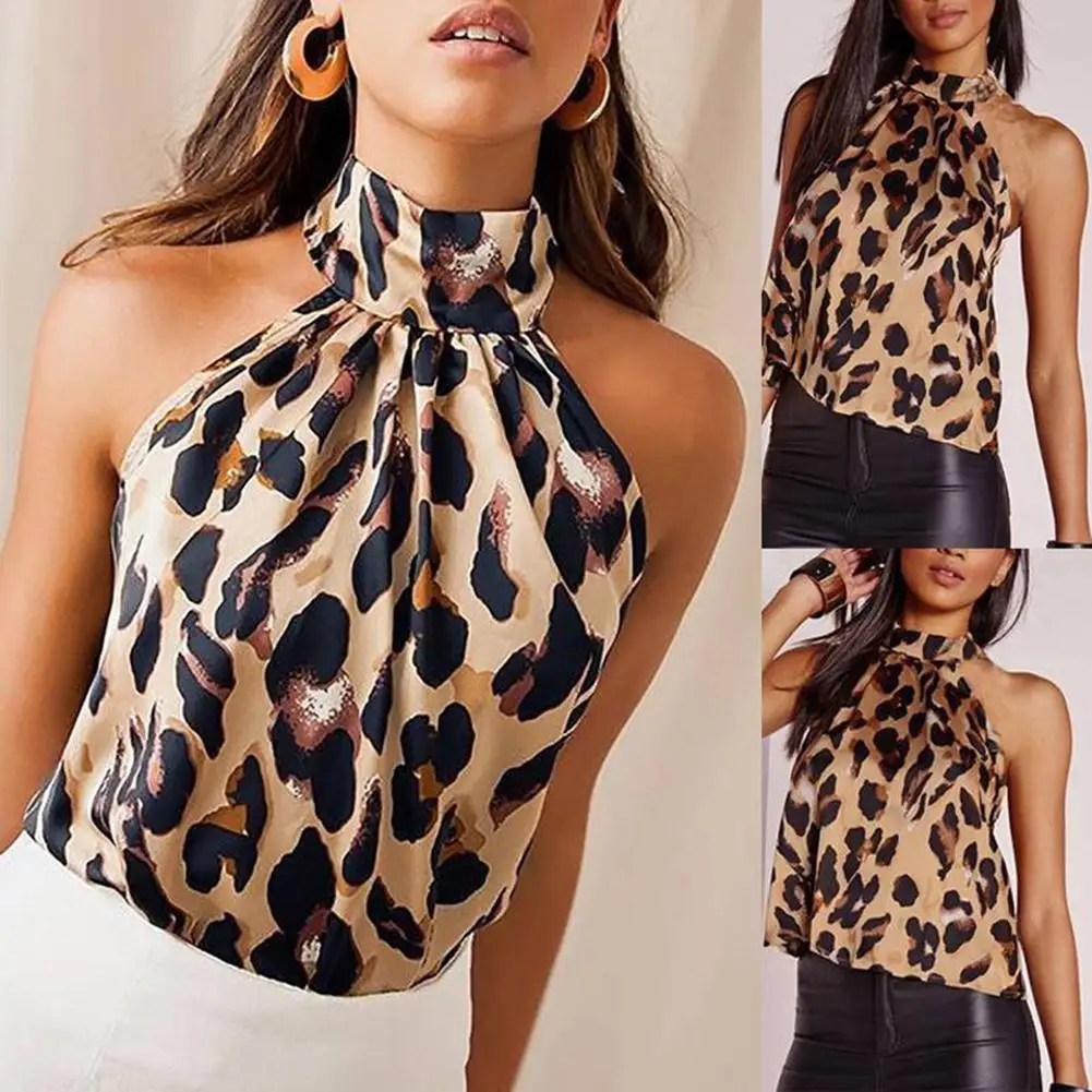Сексуальная Женская леопардовая печать с открытыми плечами без рукавов без спинки жилет Холтер майка