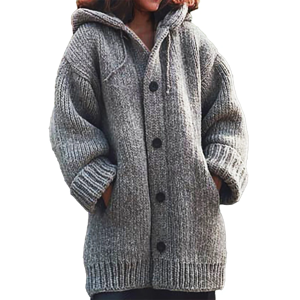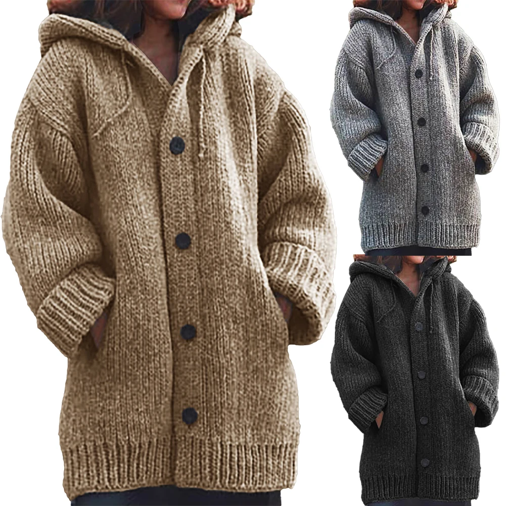 Women Winter Solid Color Single-breasted Warm Knitted Cardigan Midi Hooded Coat