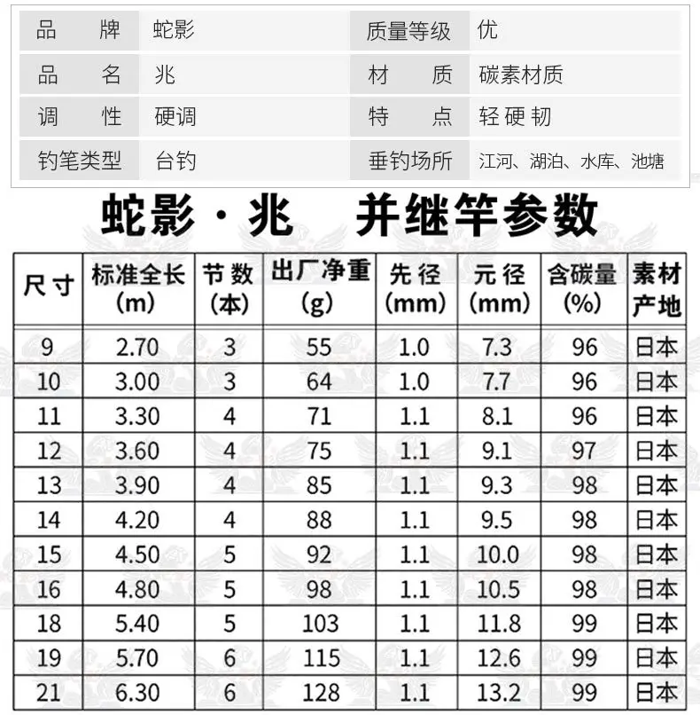 Модель (метр) | Секции | Складной (мм) | Верхний диаметр (мм) | Диаметр стыка (мм) | Вес (г) | Объем углерода (%) |