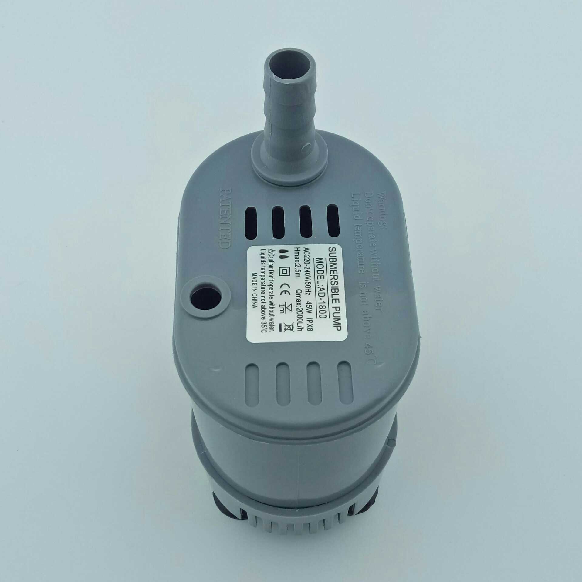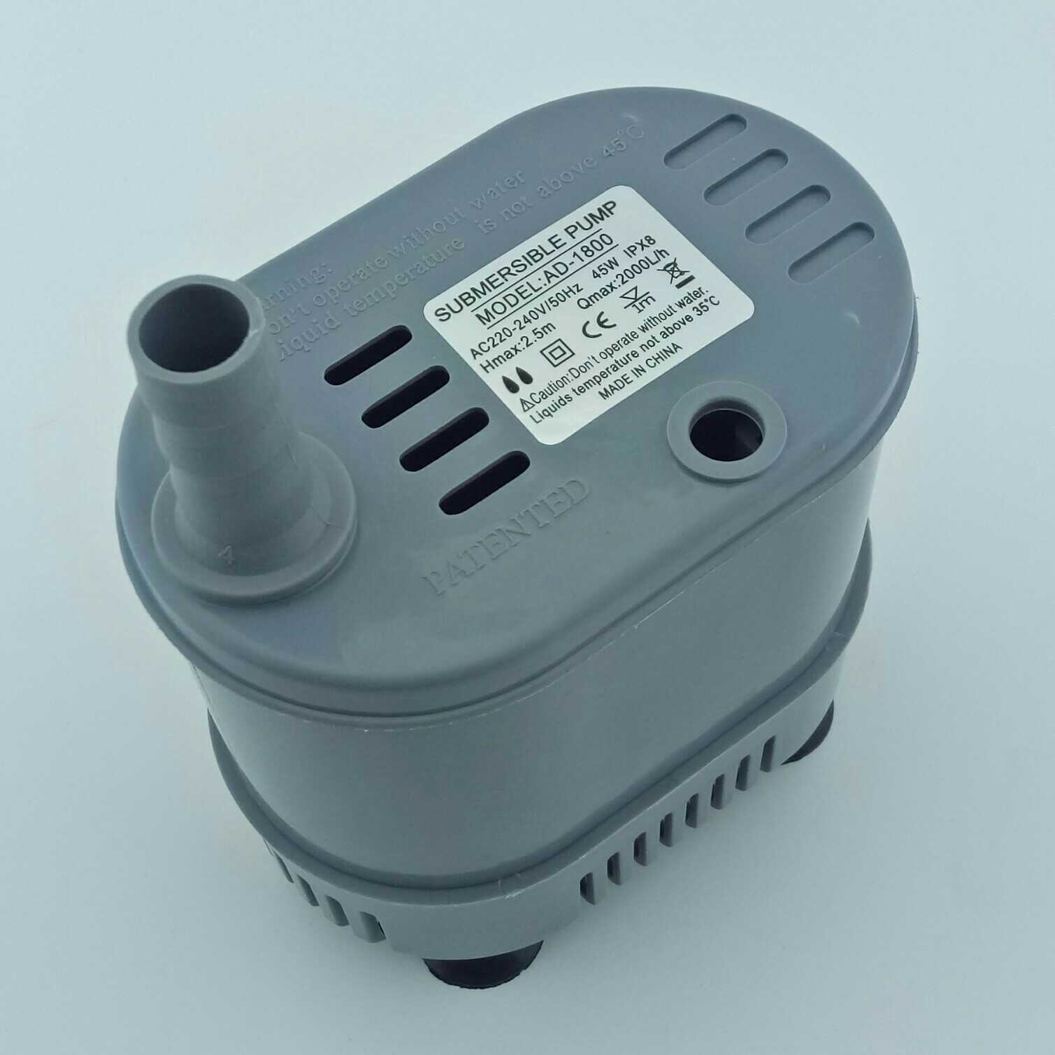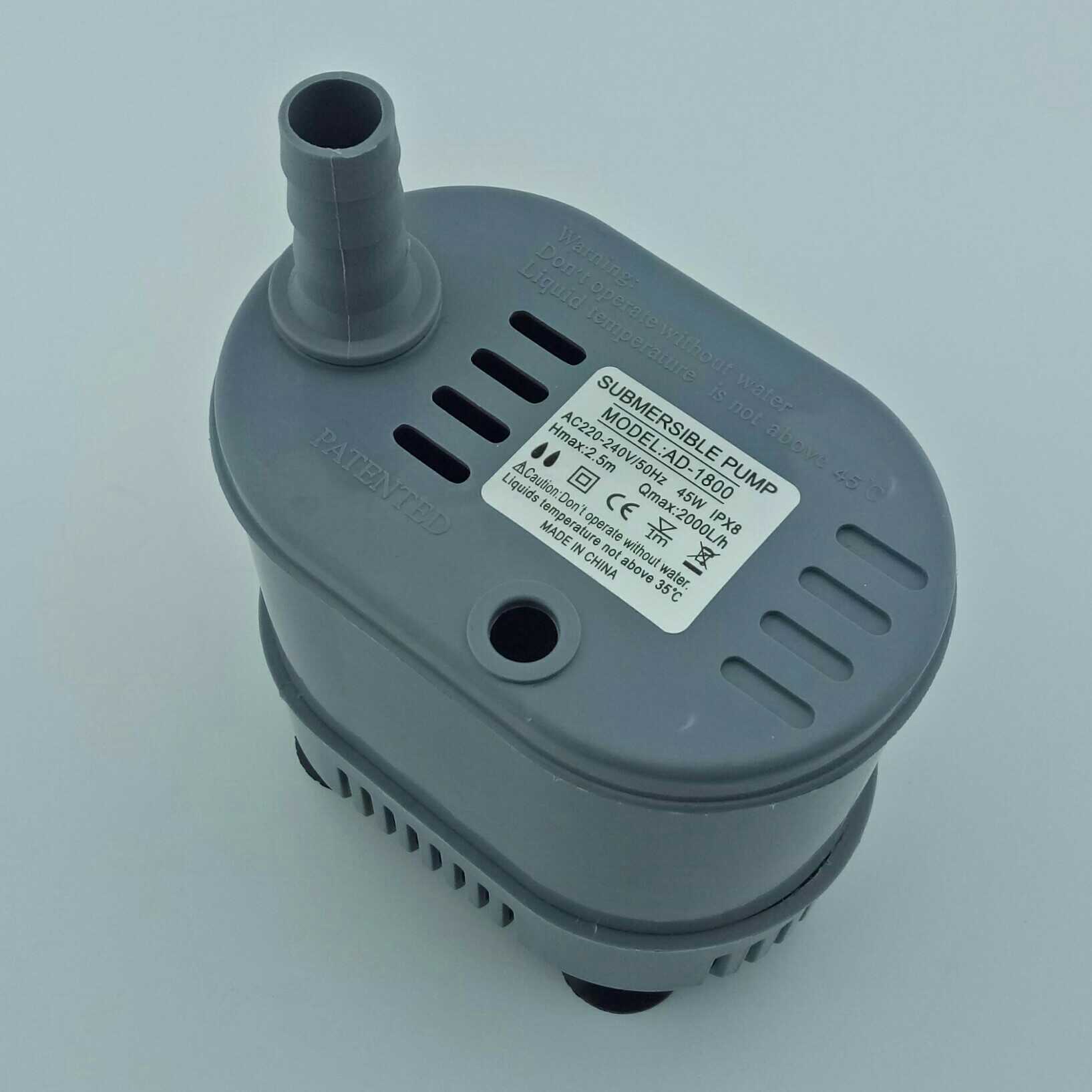Тип насоса AD-1800, 220 В/50 Гц, IPX8, 45 Вт, Hmax: 2,5 м, Qmax: 2000л/ч, с небольшим входным фильтром с присоской, длина сетевого шнура 1 м. По умолчанию 13 мм наружный диаметр разъема, если вам нужно соответствовать 19 мм, пожалуйста, оставьте сообщение при покупке.