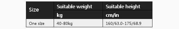 Размер::Один размер | Подходящий вес (кг)::40-80 кг | Подходящая высота (см/дюйм)::160/63-175/68.9 |