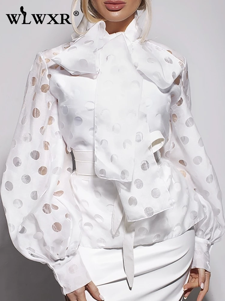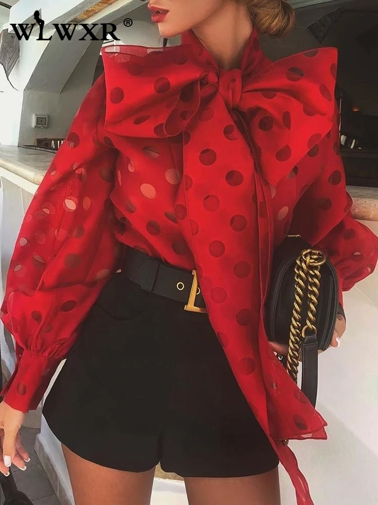 WLWXR блуза в горошек с галстуком-бабочкой из сетки женская рубашка с буфами на рукавах белая черная красная блузка женская блуза Повседневная Женская блузка