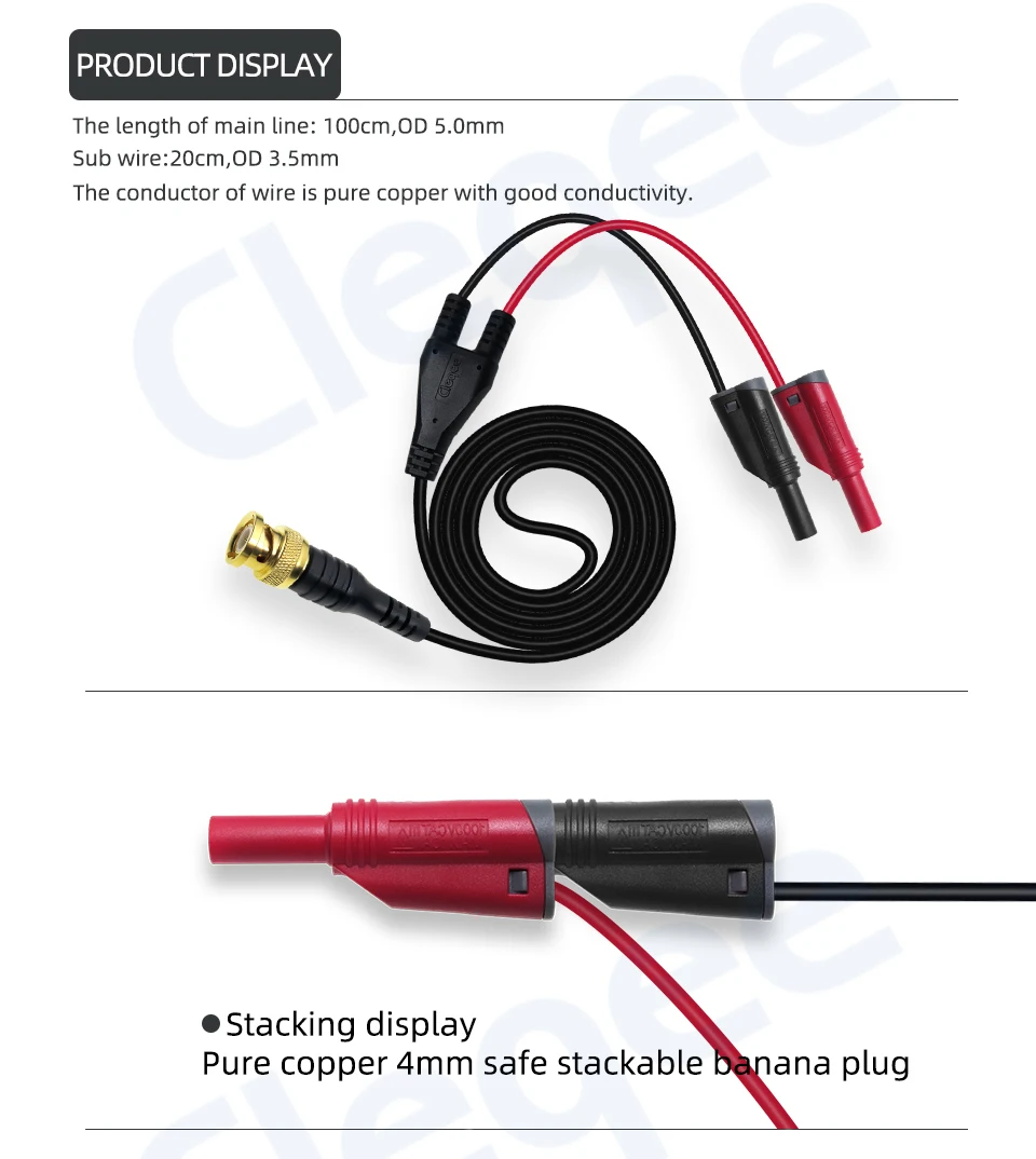 · Длина: 120 см · Материал провода: ROHS сертификация ПВХ + Оловянная медь · Материал штепсельной вилки BNC: позолоченная Чистая медь · Сопротивление: 50 Ω · Электрические характеристики: 500 В/5A · Длина основного провода: 100 см, OD 5,0 мм · Sub провода: 20 см, диаметр 3,5 мм