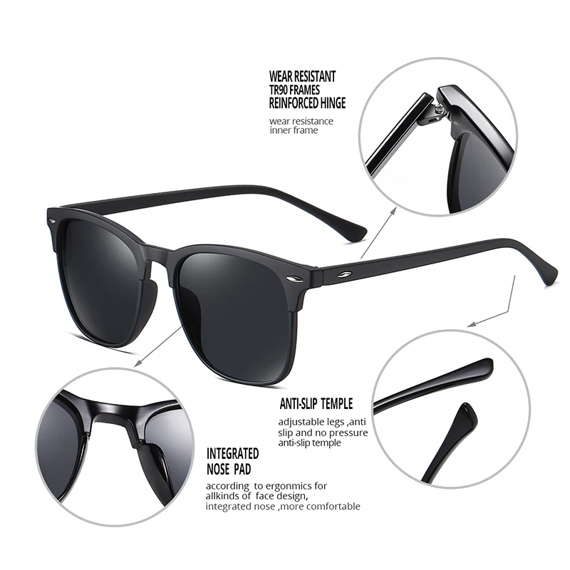 Солнцезащитные очки с поляризированными стеклами- Эти классические солнцезащитные очки поляризационные и обеспечивают 99% эффективность поляризации, блокируя и управляя УФ-и HEV светом. Обеспечивает превосходное качество изображения и защиту от бликов. Поляризованные солнцезащитные очки устраняют блики и дымку, чтобы ваши глаза были более удобными и вы могли лучше видеть. Поляризованные линзы содержат специальный фильтр, который блокирует этот тип интенсивного отраженного света, уменьшая блики.