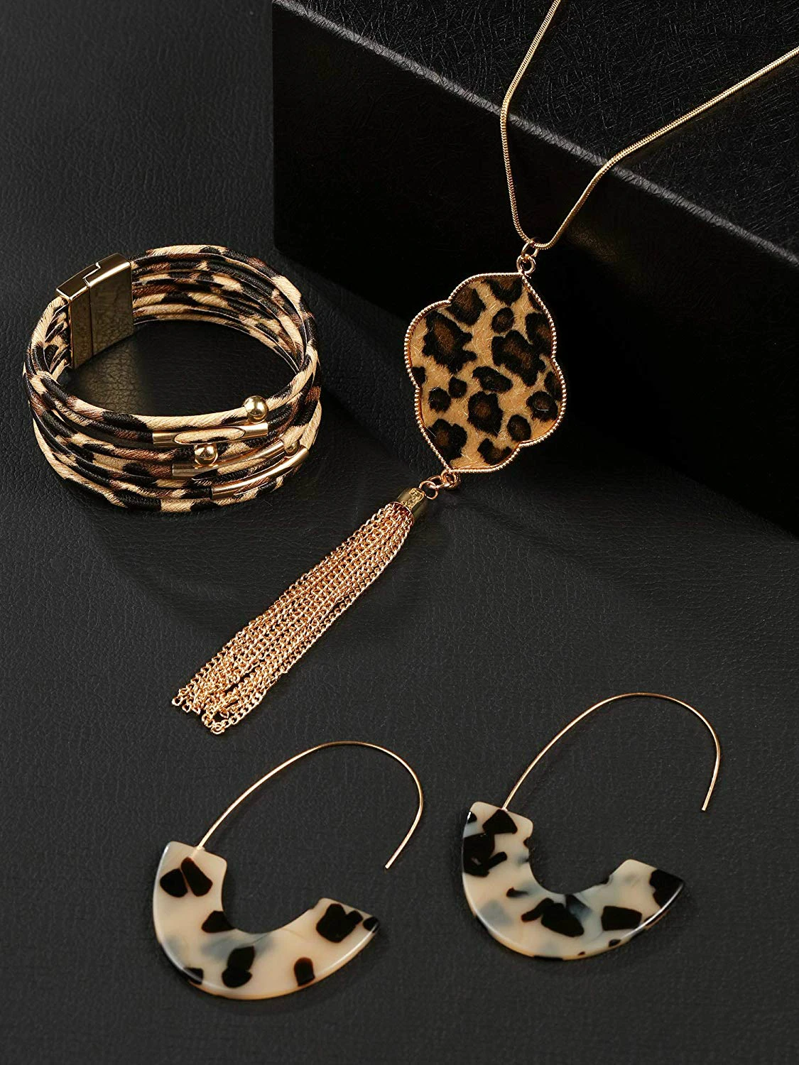 3Pcs Leopard Necklace Earrings Bracelet Set Multilayer Leather Cuff Bracelet Geometric Hoop Disc Dangle Earrings for Women