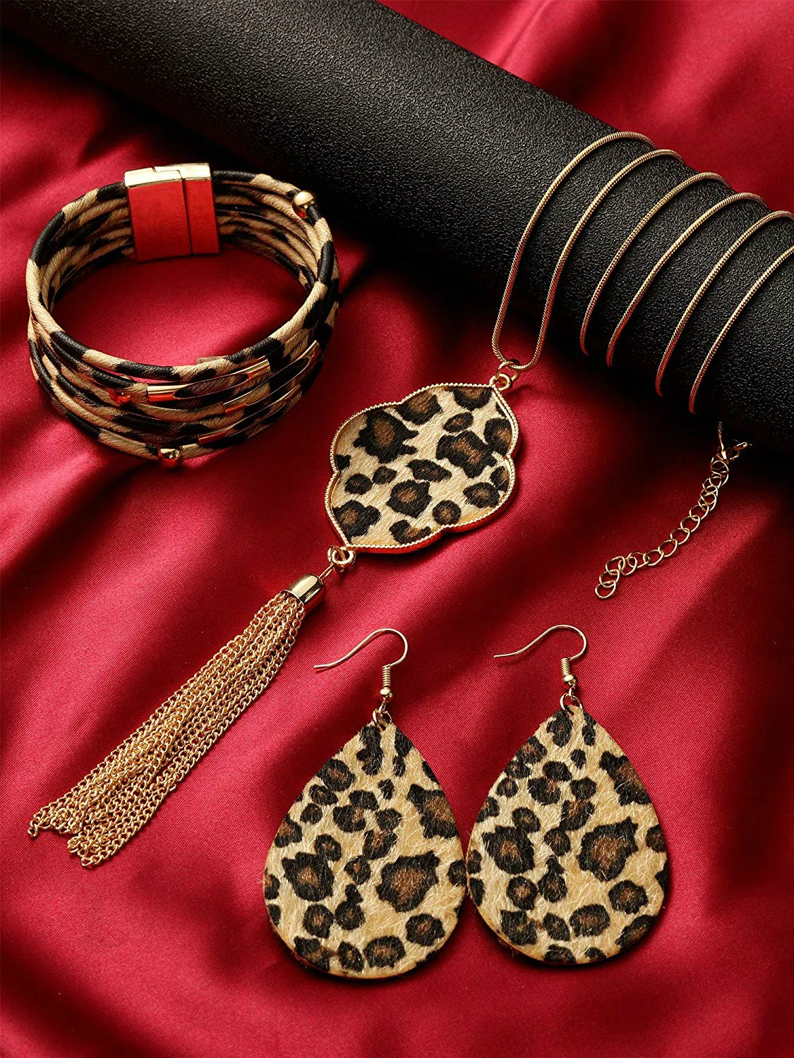 4 Pack Leopard Jewelry Set Y-Shape Tassel Necklace Leopard Rhombus Hook Dangle Earrings Multilayer Bracelet