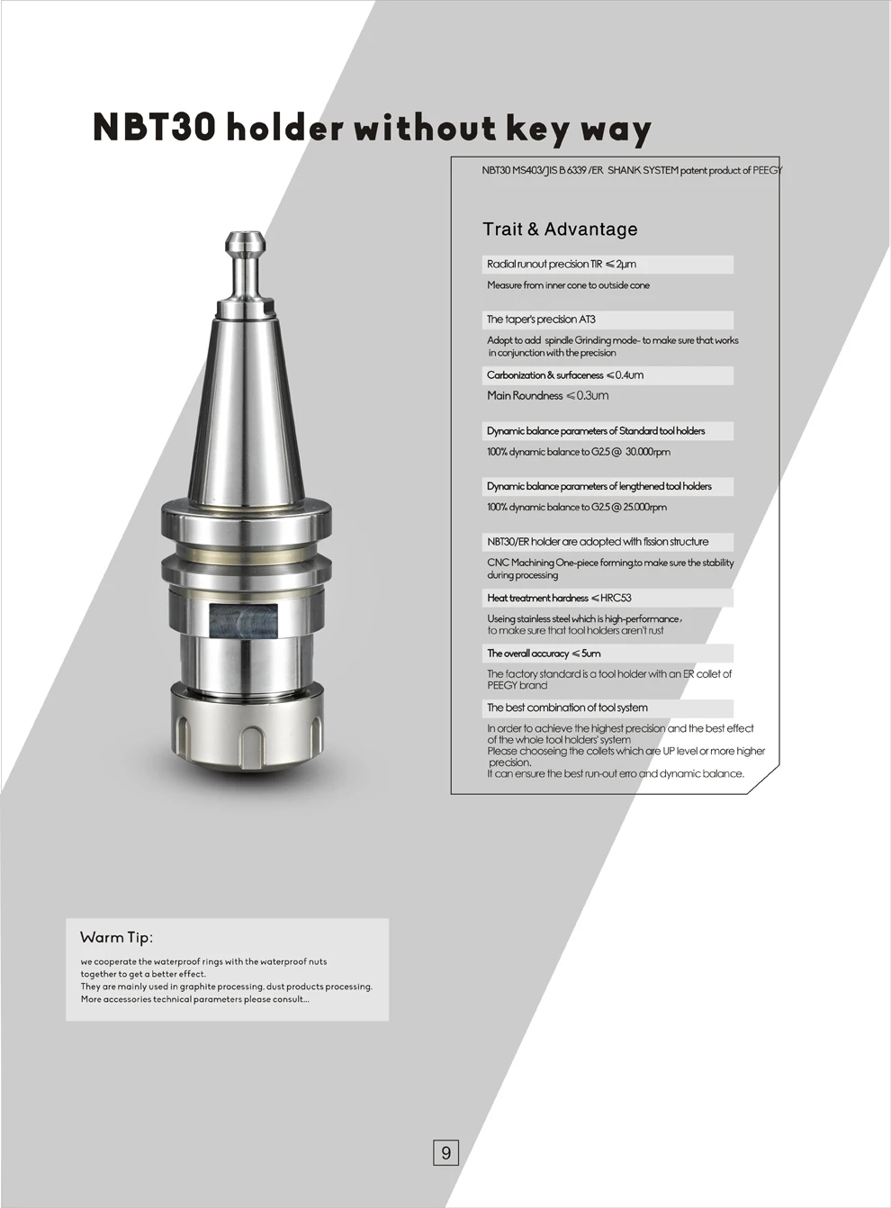 Черта и преимущества 1. Радиальная точность бега TIR ≤ 2 мкм Измерьте от внутреннего конуса до внешнего конуса 2. Точность конуса AT3 Принять, чтобы добавить режим шлифования шпинделя-сделать Убедитесь, что работает в сочетании с точностью 3. Карбонизация и поверхностность ≤ 0,4 мкм Основные овальность ≤ 0.3um 4. Параметры динамического баланса стандартного инструмента Держатели 100% динамический баланс до G2.5 @ 30,000 об/мин 5. Параметры динамического баланса удлиненного инструмента Держатели 100% динамический баланс до G2.5 @ 25,000 об/мин 6.NBT30/ER принимает цельную конструкцию С выдвижной ручкой для ногтей CNC обработка цельного формования, чтобы убедиться Стабильности во время обработки 7. Твердость термообработки ≤ HRC53 Использование нержавеющей стали, которая является высокой- Производительность, чтобы убедиться, что держатели инструментов Это не будет ржаветь 8. Общая Точность ≤ 5 мкм Заводской стандарт-это держатель инструмента с ER Коллет бренда MEK.