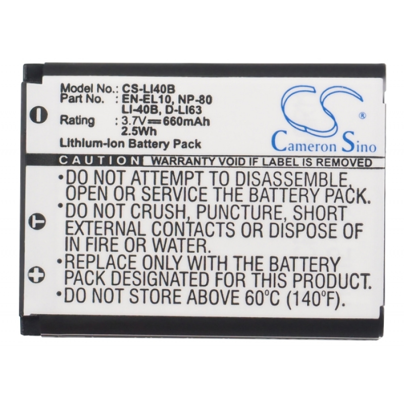 , а также подходит для некоторых других моделей, не перечисленных в этом списке.Подходит для замены аккумуляторов с номерами (partNo): 40B, EN-EL10, LI-42B, LI-40B, NP-80, GB-10, D-LI63, 02491-0053-00, BL-40B-500, SL7014, DLI216, BL-40B, DS5370, NP-82, а также 02491-0061-21, 2H.02A1M.001, D032-05-8023, VG037612210001, 02491-0056-00, 02491-0057-00, 02491-0066-00, 02491-0066-17, BL-058, DLO40B, D016, D-LI108, DLO40B-PR, CS-LI40B