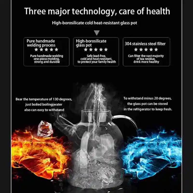 Корпус из боросиликатного стекла, безопасный без свинца, холодный и жаростойкий, для защиты здоровья вашей семьи. 304 фильтр из нержавеющей стали может фильтровать большинство остатков чая, более удобно. Выдерживает 130 градусов Цельсия (просто кипяченая вода также легко справиться), но также может выдерживать температуры минус 20 градусов Цельсия (стеклянный горшок может быть помещен в холодильник, чтобы сохранить свежесть). Крышка из нержавеющей стали 304, прочная и более здоровая. Традиционная бамбуковая крышка легко заплесневелая деформация, не прочная. Округлый рот, спиральный дизайн, не беспокойтесь об оттоке чайного остатка, рот овальный, легко налить