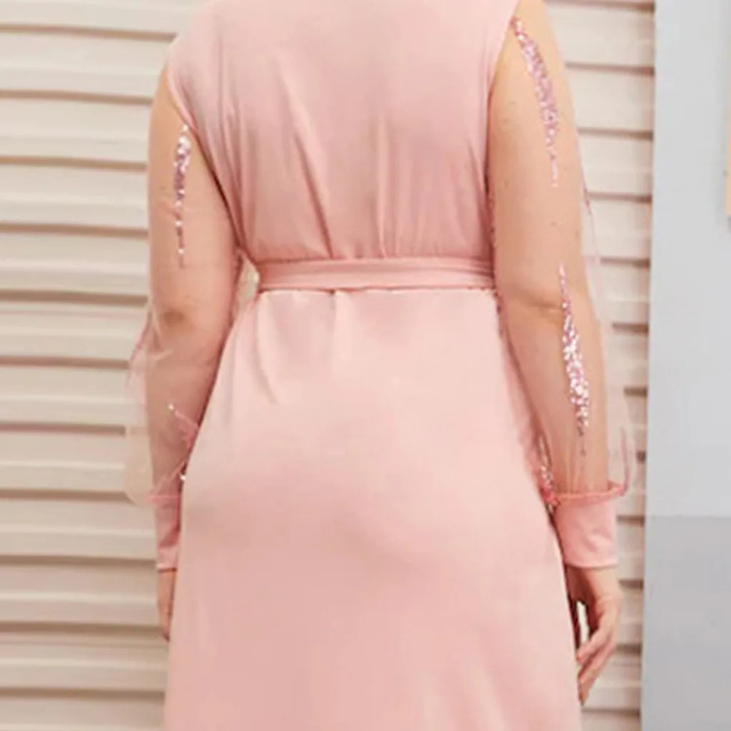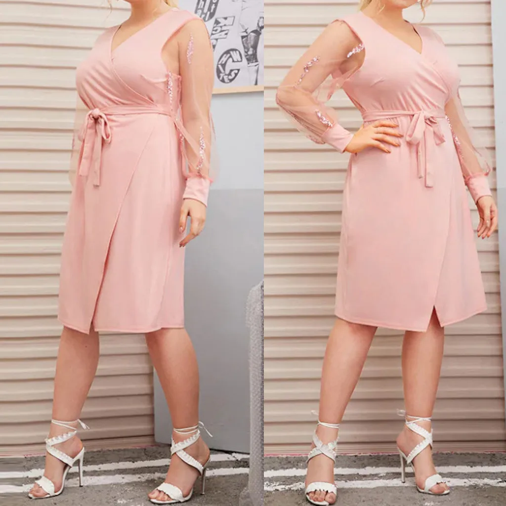 1. Особенности: модная повседневная одежда, размера плюс, v-образный вырез, сетка, длинный рукав, разрез, бандаж, свободное платье.