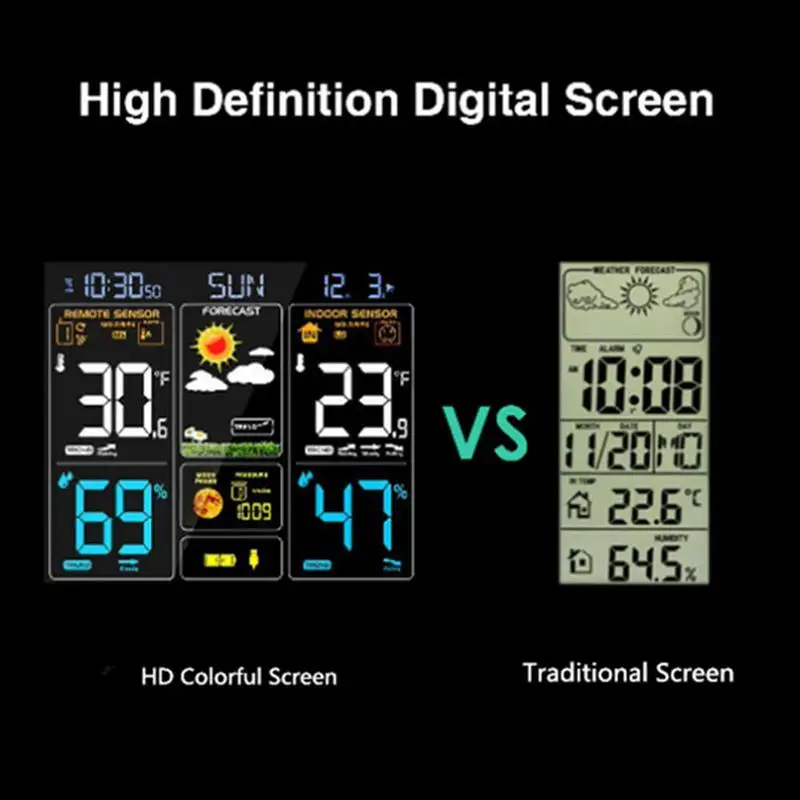 Цифровой экран высокой четкости: дисплей обеспечивает достаточно большой и четкий экран для удобного просмотра. Легко получить информацию о дате, времени, давлении воздуха, температуре и влажности внутри и снаружи. поддерживается дополнительный ежедневный будильник в формате 12/24 часов и функция повтора. динамичный погода: предсказание шести видов погоды: солнечная, слегка облачная, облачная, дождливая, Тяжелая дождливая и снежная.