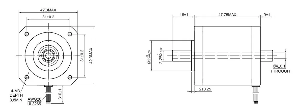 Размер оправы: 42x42 ммДлина корпуса: 47,75 ммНаружный диаметр вала: Φ8 ммВнутренний диаметр вала: Φ4 ммДлина переднего вала: 16 ммДлина заднего вала: 9 ммКоличество проводов: 4Длина свинца: 310 ммВес: 0,26 кг
