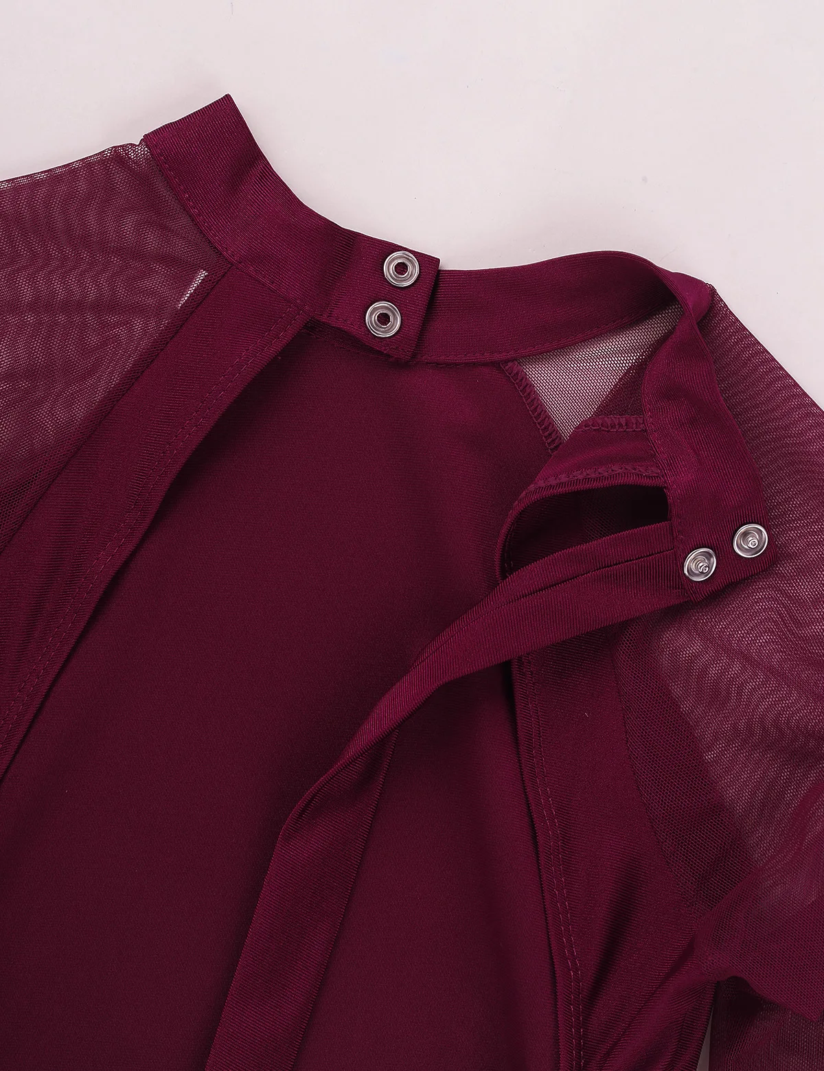 Отвесные длинные рукава, ложная горловина с застежкой на пуговицы. Тюлевое соединение на двух сторонах талии. Открытая спина с вертикальным ремешком.
