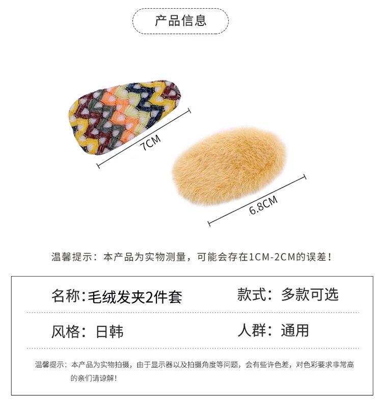 Пол: для девочек Тип: Головные уборы Цвет: розовый/бежевый/зеленый/фиолетовый/желтый Размеры: 6,8/7 см Сезон: Весна/лето/осень/зима Посылка включает в себя: 2 шт./компл. заколки для волос