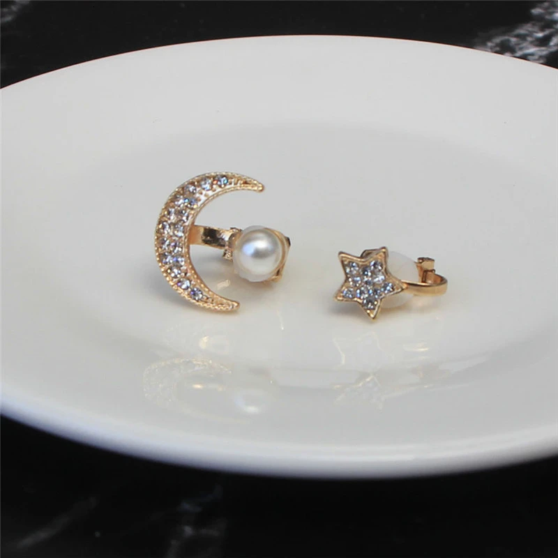Стразы, звезда, клипсы, серьги, луна с жемчугом, серебро, золото, асимметричная серьга, без пирсинга, ювелирные изделия для женщин