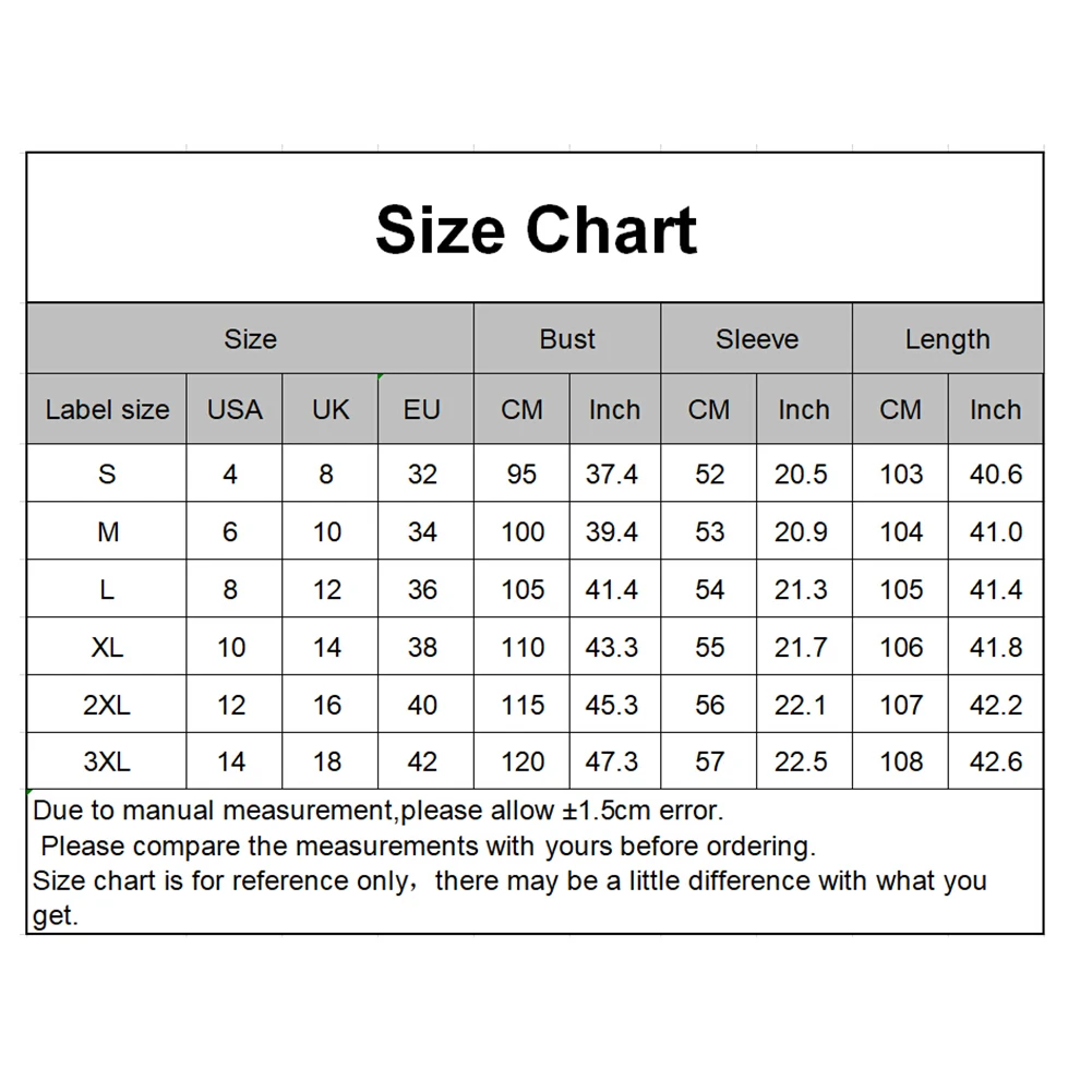 [Наш Размер M] Обхват груди: 100 см/39,37 ", рукав: 53 см/20,87", Длина: 104 см/40,94 "(прибл.)