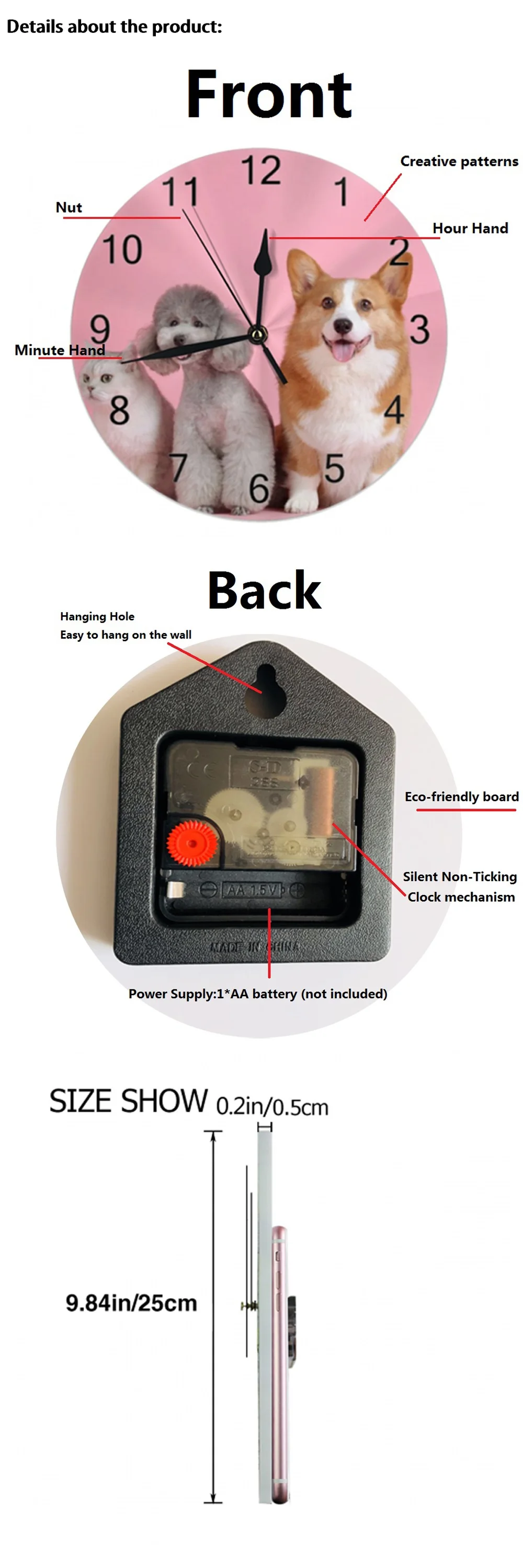 Материал: полихлорвиниловых досок Совершенно новый и высокое качество. Более долговечное и долгосрочное использование. Легко повесить на стену и удобно получить время. Экологически чистый, нетоксичный и безопасный для детей, не принесет загрязнения жизни. Регулировка разборки оболочки ядра указателя. Органический пластиковый материал, который выбирает защиту окружающей среды, не принесет загрязнения жизни, а печать яркой не выцветает.