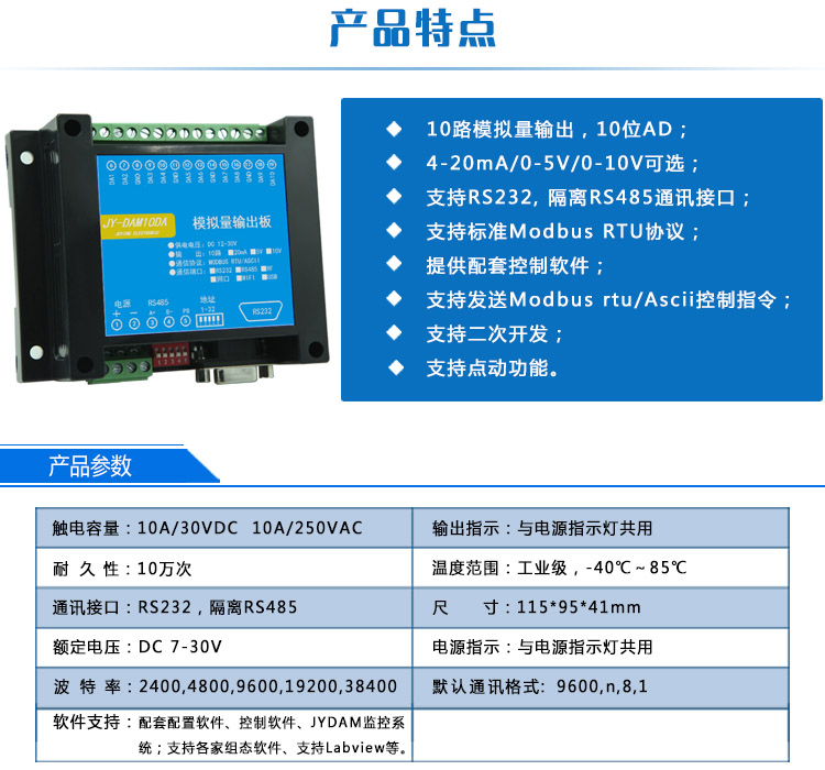 模拟量输出 | 10DA | 10 路da | RS485 通讯隔离,RS232 为 DB9 接口,默认输出 4-20mA |