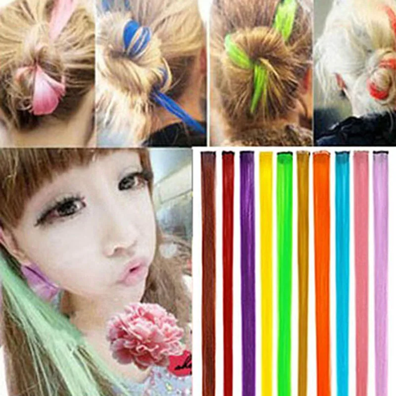 Цветные яркие синтетические волосы для наращивания на заколках, цельные цветные полоски, длинные прямые волосы для любителей спорта
