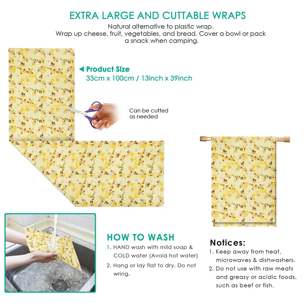 100x33 см многоразовая пищевая обертка из пчелиного воска в рулоне с нулевыми отходами Экологичная устойчивая эластичная крышка упаковщика для хранения пищевых продуктов