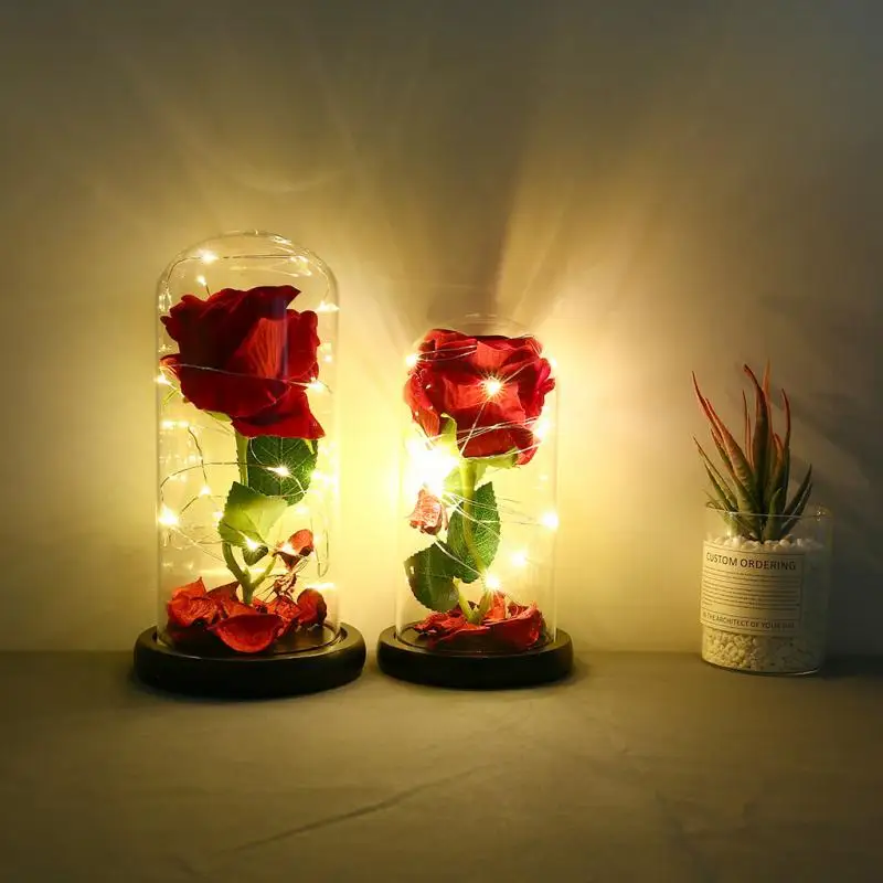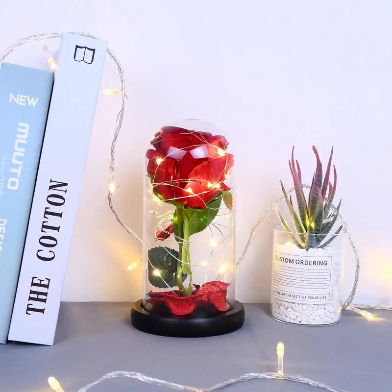 Материал: цветок розы + стеклянная крышка + деревянная основа + 20led медная проволочная лампа