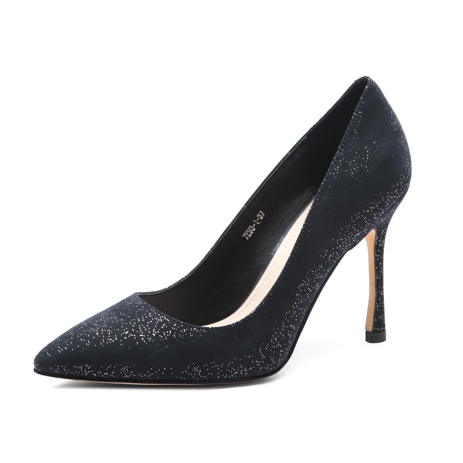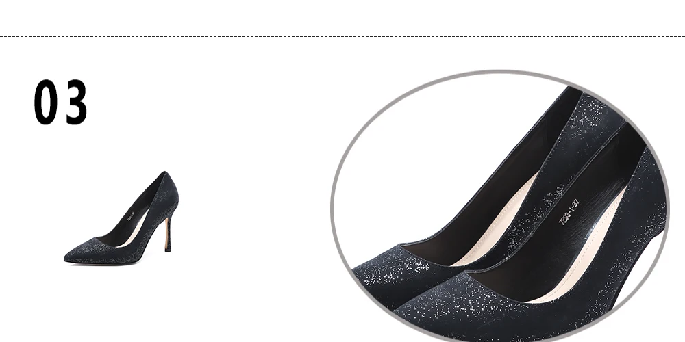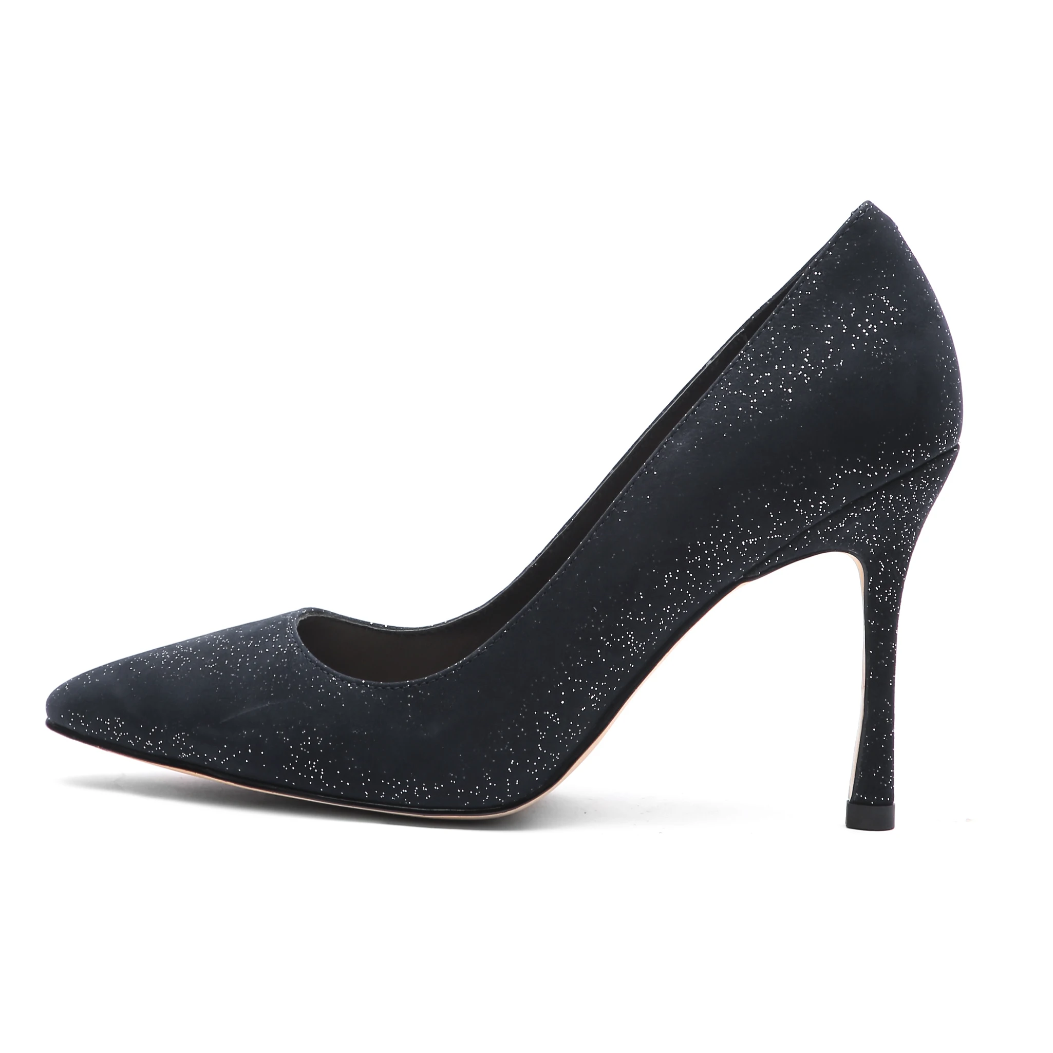Темно-синяя кашемировая поверхность покрыта яркой порошковой пленкой, вамп блестит, ослепительно