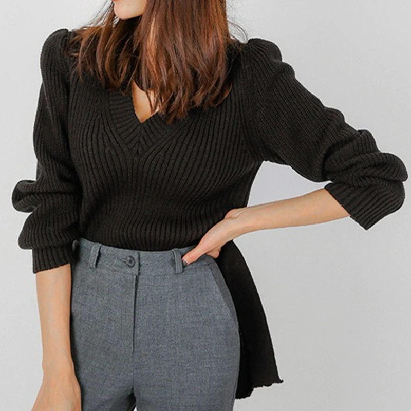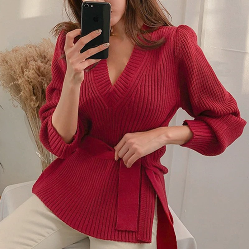 Этот свитер с v-образным вырезом в мягком и теплом рубчик с поясом на талии. С разрезом сбоку, пышными плечами и длинными рукавами с манжетами в рубчик. С высоким и низким подолом.