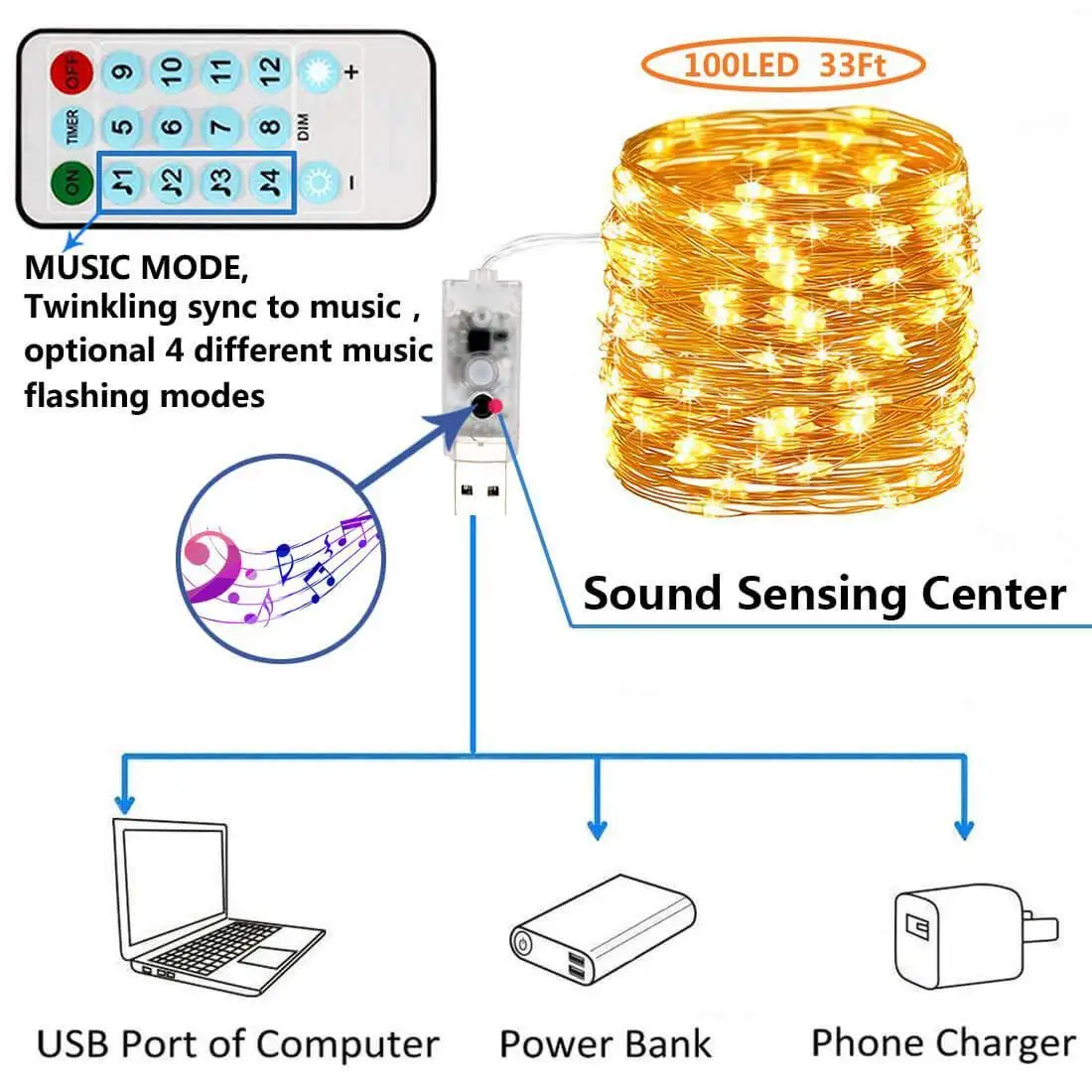 100 ламп с дистанционным управлением 8 узоров музыкальный светодиодный светильник