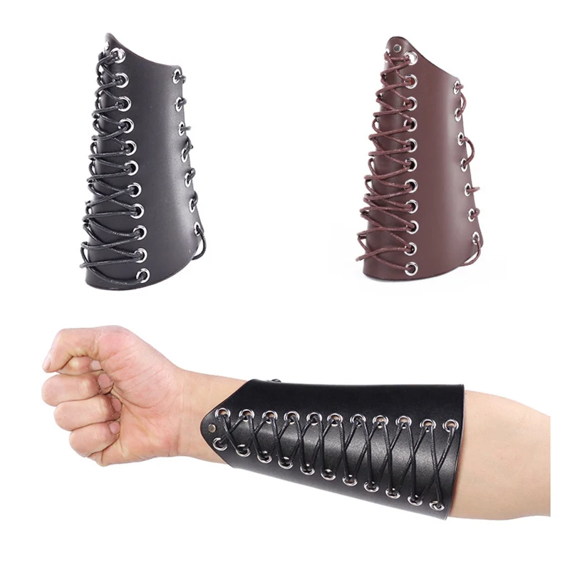 -Ткань из искусственной кожи. -Черный, коричневый, однотонный. -Шнуровка, дизайн с пряжкой. -Внутри замша, нейлоновый шнурок. -Подходит для стрельбы из лука, охоты, стрельбы, спорта на открытом воздухе, косплея, личинки, сцены. -Платье в качестве солдата, воина, офицера, рыцаря, охотника, лучника или пирата и т. д. -Защитный аксессуар для запястья. -Посылка включает: 1 шт.