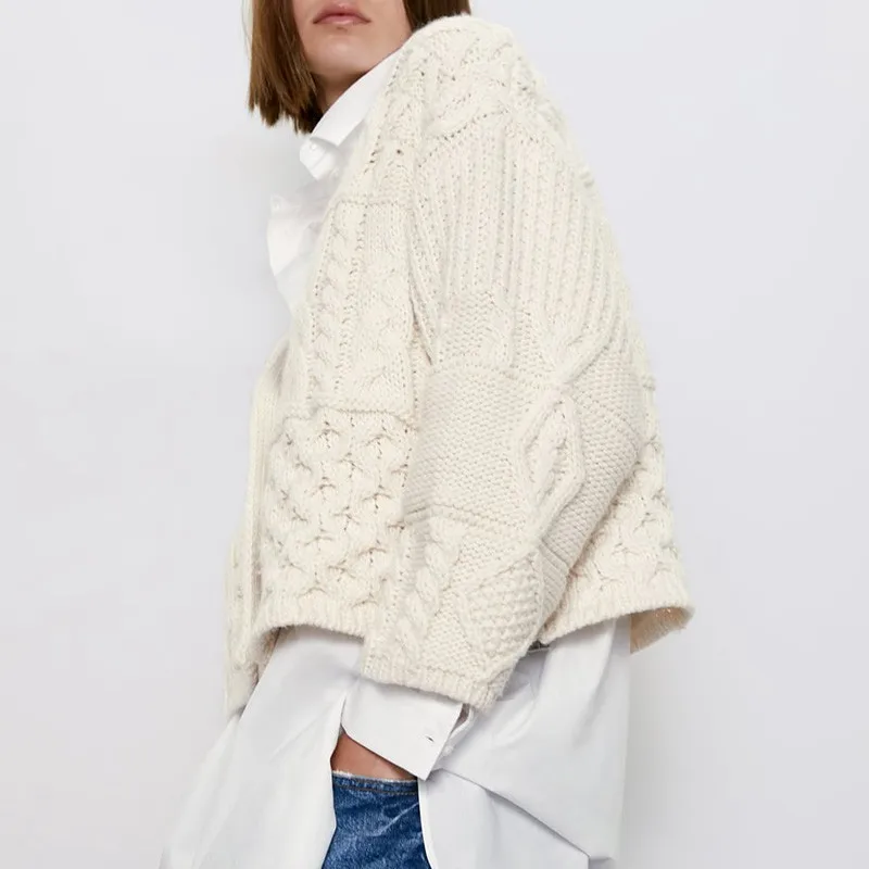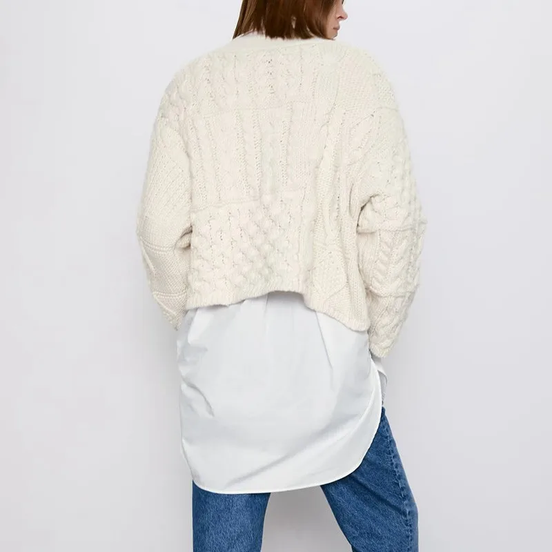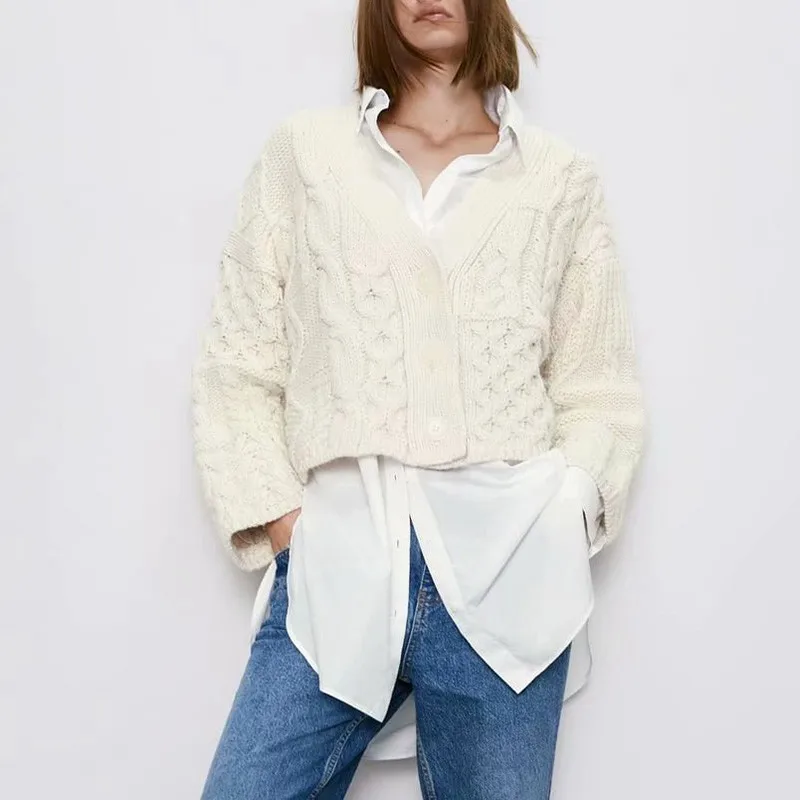 Женский вязаный укороченный свитер, Белый свободный свитер в Корейском стиле с v-образным вырезом и длинным рукавом, модный топ