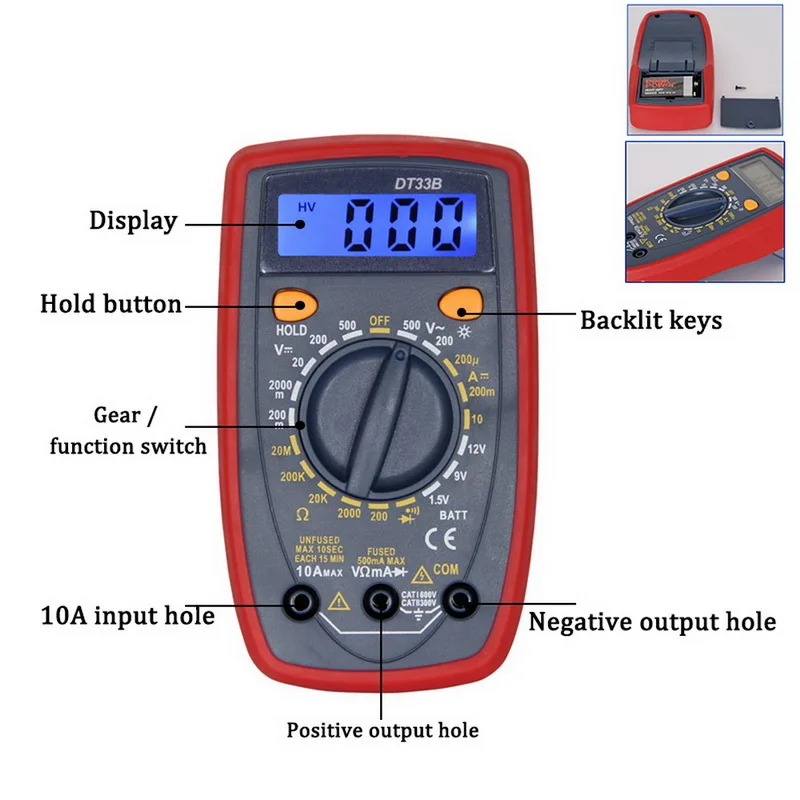 * Функция: помогает измерять напряжение постоянного/переменного тока, постоянный ток, сопротивление, диод, зуммер, непрерывность и многое другое.