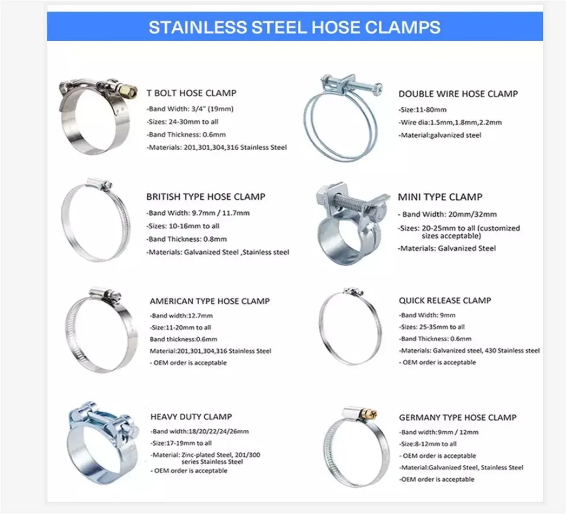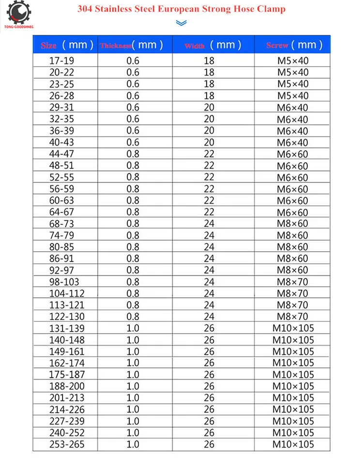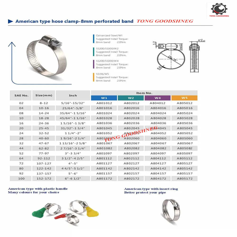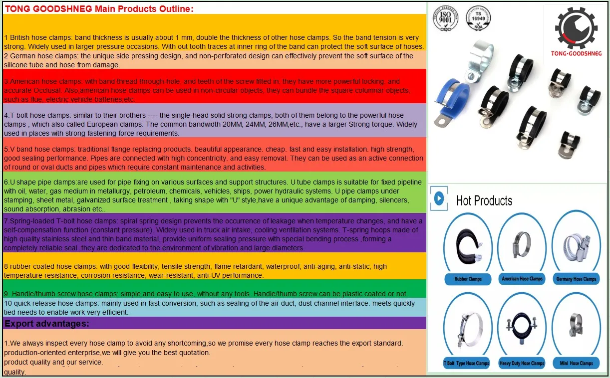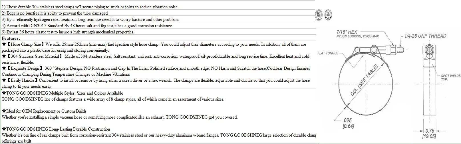 ⑤ Tong GOODSHNEG доступны несколько стилей, размеров и цветов Линия зажимов TONG GOODSHNEG имеет широкий ассортимент из 8 стилей зажимов, все из которых поставляются в ассортименте различных размеров. ⑤ Идеально подходит для замены OEM или сборки на заказ Если вы устанавливаете простой вакуумный шланг или что-то более сложное, как выхлопная труба, TONG GOODSHNEG получил вас покрытым. ⑤ Tong GOODSHNEG долговечная прочная конструкция Линейка хомутов для ушей, изготовленная из коррозионно-стойкой нержавеющей стали 304 или из наших сверхпрочных алюминиевых v-образных фланцев, TONG GOODSHNEG предлагается большой выбор долговечных зажимов