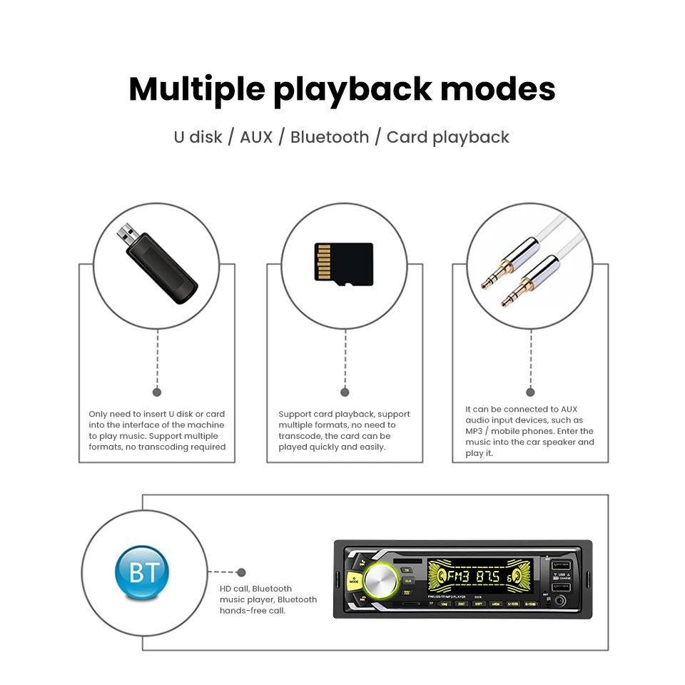 Многофункциональный Bluetooth автомобильный mp3-плеер Храктеристика устройства: Встроенный Bluetooth + микрофон Поддержка звонков в режиме hands-free. Поддержка расширенного режима передачи звука. Поддерживает часы, указывающие при отключении питания. Высококачественное цифровое стерео fm-радио Поддержка трехдиапазонного радио магазина FM1-FM2-FM3, и может предустановка 18 радиостанций. (Радиочастота: 87,5-108 МГц) Поддержка USB/TF карт-ридер Поддержка аудио: MP3/WMA/WAV форматы и так далее. Поддержка папка для воспроизведения Функция Поддержка пульт дистанционного управления. Поворотный электронный регулятор громкости Воспроизведение MP3 поддерживает паузу/предварительный просмотр/повтор/случайное воспроизведение и 10 треков вверх/вниз. Электронный Тип бас/ВЧ/левый и правый баланс/передний и задний баланс регулятор громкости Переднее входное отверстие AUX аудио и заднее выходное отверстие L/R аудио RCA. 4 дорожки высокой мощности (4 громкоговорителя высокой мощности) Работа Напряжение: DC12V FM радио. Частота: 87,5-108,0 МГц .. Практичный Чувствительность: S15Db Разрешение стерео:> 25 дБ SNR (Отношение сигнал-шум):> 60 дБ Поддержка формата музыки: MP3/WMA Дисплей поддерживает: дисплей ld3 Искажение: 0. 3% SNR (Отношение сигнал-шум):> 60 дБ Ознакомление с функцией кнопок панели: 1, Мощность: открыть/закрыть машину. 2, диапазон: радиопереключатель в FM1, FM2, FM3. 3, выбор радио песни, функция быстрой передачи. 4, Sel: Регулировка звука. В работе нажмите на ручку, можно регулировать в свою очередь басы, Высокие частоты, баланс левого и правого каналов, тяжелые басы, звуковые эффекты эквалайзера. 5, Vol: Регулировка размера громкости. 6, номерные ключи 1.2.3.4.5.6, в режиме радио, долго нажимайте ключ Номера для хранения радиоканала. В режиме воспроизведения: 1 на паузе, 2 на 10 секунд предварительного просмотра, 3 на повторном воспроизведении, 4 на случайном порядке Воспроизведено. 5 и 6-выбор папок. 7, ЖК-дисплей. 8, TF/USB слоты для карт. 9, USB разъем. 10, ИК: Удаленное окно получения. 11, CLK: Нажмите, чтобы отображать время; долго нажмите клавишу CLK, когда часовая часть мигает, вращается Ручка может регулировать часы, нажмите на ручку, минутная часть мигает, Вращающаяся ручка может регулировать Минут, нажмите CLK confirm save. 12, переключатель тестового режима. 13, Aux: можно подключить мобильный телефон, MP3, MP4, MP5 и другие аудио через машину Вход в автомобильный клаксон для воспроизведения