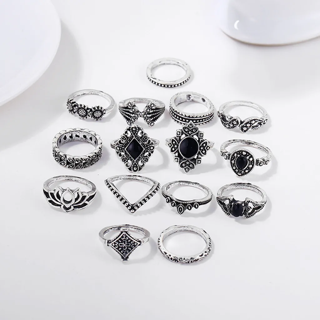 15pcs Silver Color Hollow Lotus Opal Vintage Rings Women Knuckle Ring Set for Mid Finger Thin Bague anillo12.27 | Украшения и