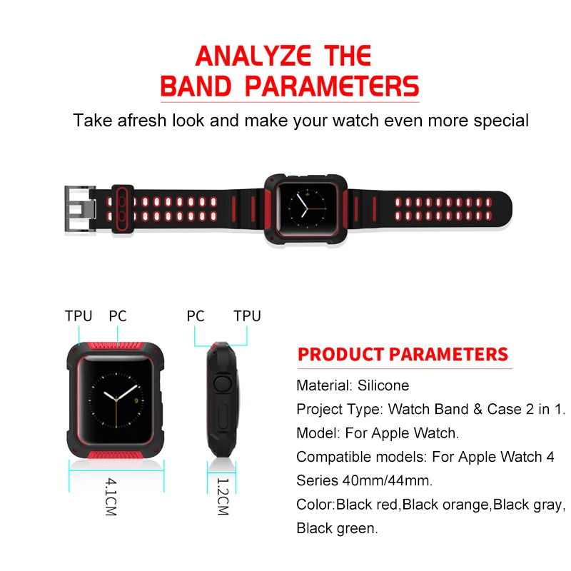 Описание: Совместимая модель: идеально подходит только для Apple Watch 4 44 мм, для iwatch серии 4. Уникальный и креативный дизайн. Выделите браслет позволяет вам производительность на любой случай Четыре цвета на выбор: черный, красный, черный, оранжевый, черный, зеленый, черный, серый. Дизайн ремешка + Чехол: гибкий Регулируемый силиконовый ремешок для часов включает амортизирующий чехол-бампер. Дополнительная лента не требуется. Ремешок и чехол 2 в 1 более удобны. Ударопрочный: усовершенствованная двухслойная конструкция, изготовленная из высококачественного ПК и силикона, прочная конструкция ударов и ударов обеспечивает максимальную защиту от ударов и царапин для ваших часов Apple. Точные вырезы: легкий доступ ко всем элементам управления, кнопкам и датчикам ваших часов. Легко использовать чехол. Без защитного слоя, вы можете прикоснуться к экрану часов сам, очень отзывчивый и беспрепятственный. Простота установки: Просто вставьте его в заднюю крышку. Упрощает процесс установки. Надевайте или снимайте в любое время. Примечание: 1 * силиконовый ремешок Apple watch и защитный чехол, Смарт-часы и другие аксессуары в комплект не входят.