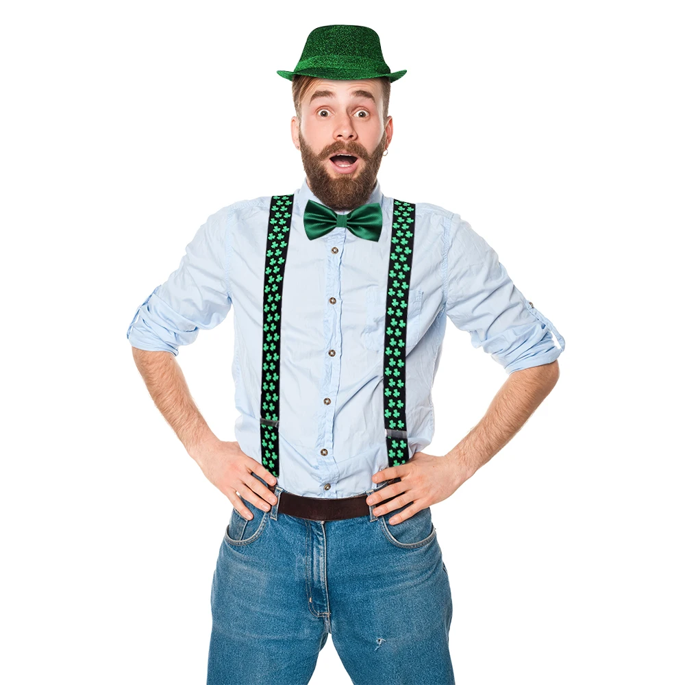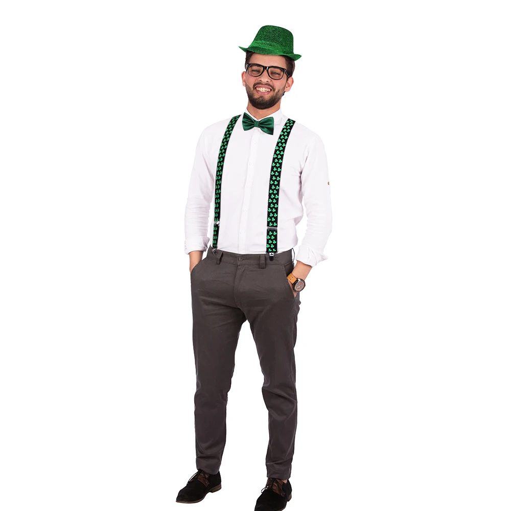 День Святого Патрика, ирландский зеленый Федора шляпа подтяжки галстук бабочка костюм для мужчин Leprechaun Клевер фестиваль Карнавал вечерние аксессуары