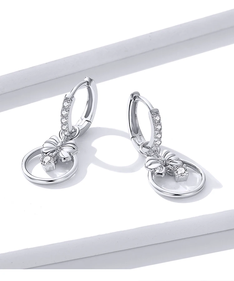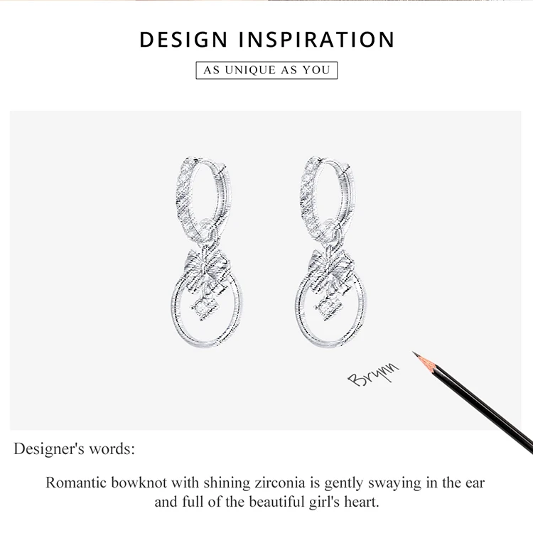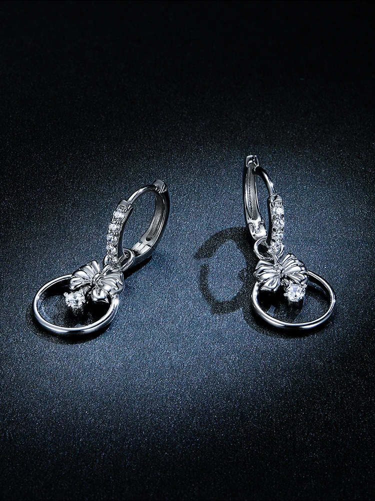 Material: S925+Plated platinum+Pavé Setting CZ Size:2.6*1.1cm Description: Romantic bowknot with shining zirconia is gently swaying in the ear and full of the beautiful girl's heart.