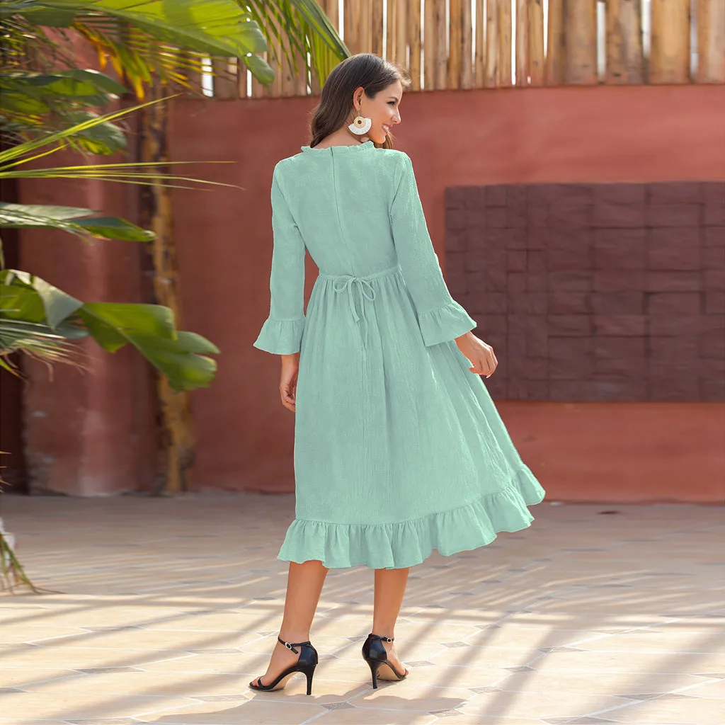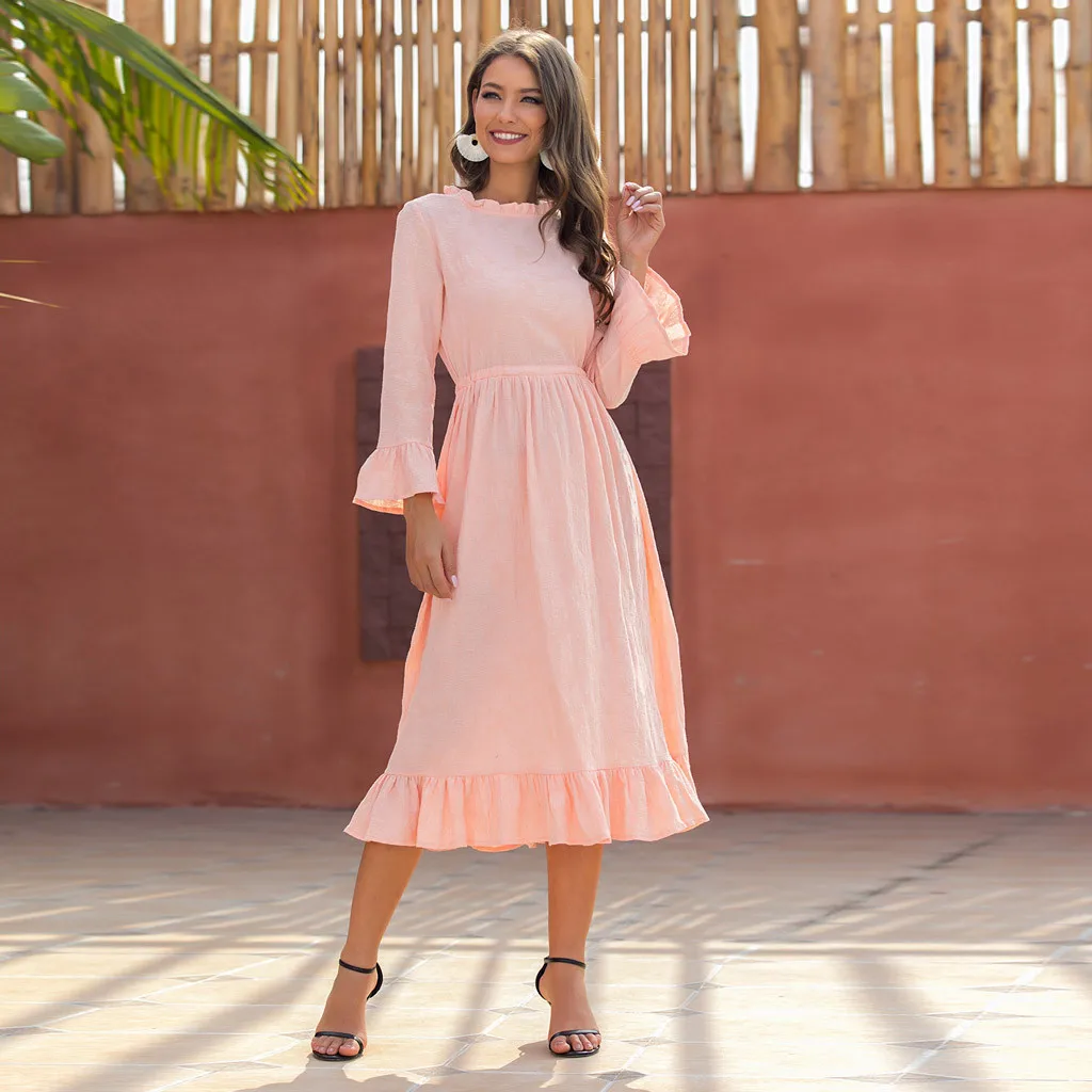 Женское модное Хлопковое платье до середины икры с длинным рукавом и круглым вырезом; Вечерние платья