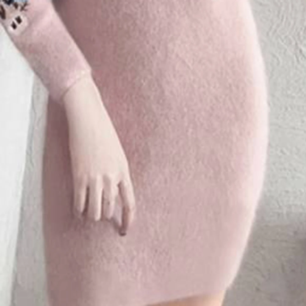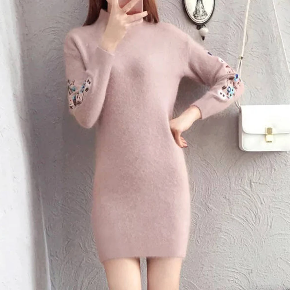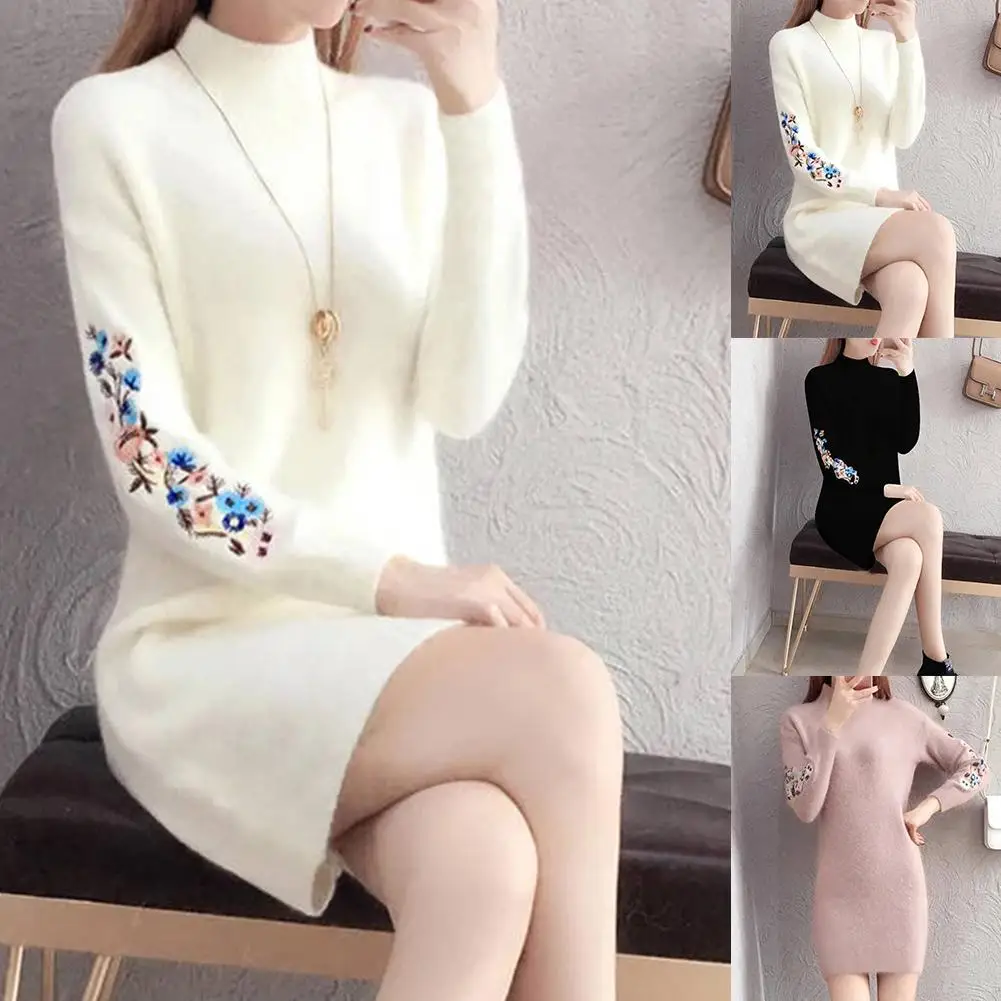 Зимний женский Повседневный вязаный свитер с цветочной вышивкой и длинным рукавом и круглым вырезом мини-платье