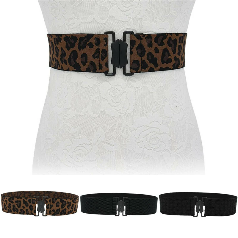 Женский широкий эластичный пояс леопардовой расцветки, модный пояс с пряжкой на талии, растягивающийся пояс с черной пряжкой, толстые эластичные тянущиеся ремни