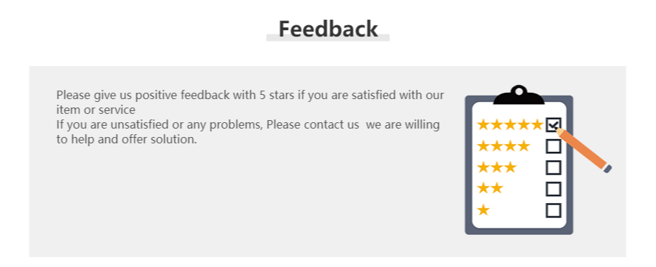 2. Не оставляйте негативные отзывы, не спрашивая нас о помощи, пожалуйста, не стесняйтесь связаться с нами, если у вас есть какие-либо проблемы. Отзывы-это наша жизнь, прежде чем оставить нейтральный или отрицательный отзывы, пожалуйста, свяжитесь с нами, чтобы получить лучшее решение, мы ответим на все сообщения как можно быстрее, заранее спасибо за ваше терпение.