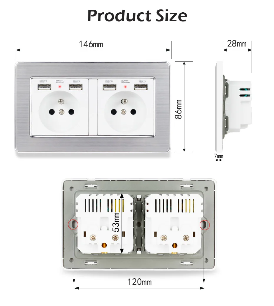Esooli 2 Gang французский стандартный настенный разъем панель из нержавеющей стали с 4 USB зарядным портом скрытый мягкий светодиодный индикатор