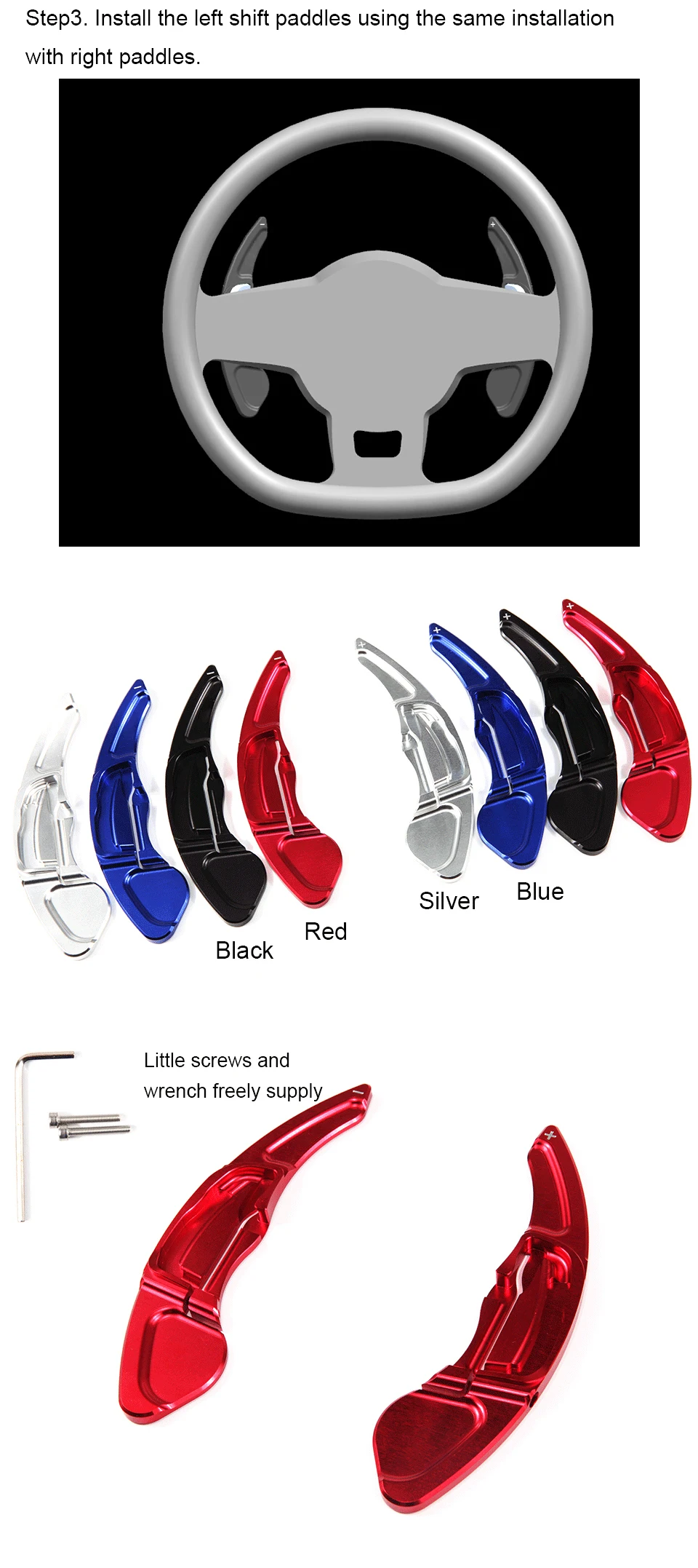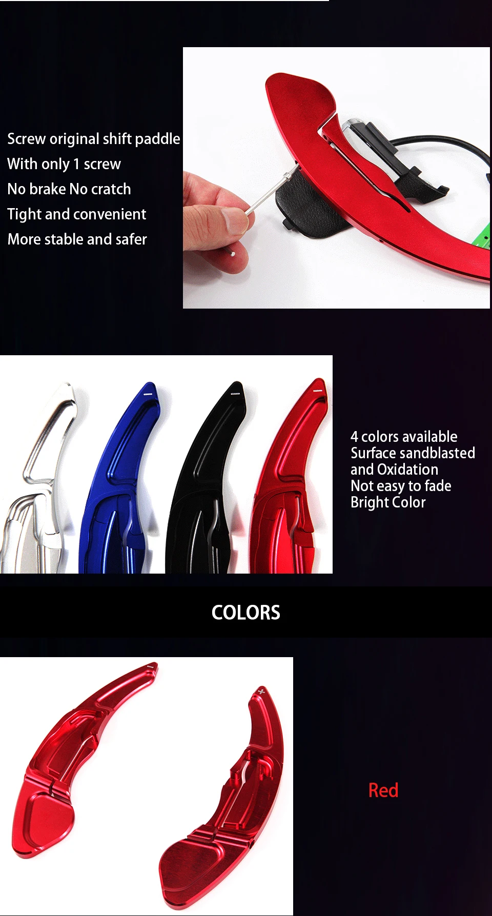 This is a listing for 2 pieces of aluminum alloy wheel shift DSG paddle shifter extension. Unique sport style shift paddle for ugrading the styling of your car. Made of high quality aluminum, smooth cut finish, perfect handling feeling. They are great extension retrofit device for your favorite car.
