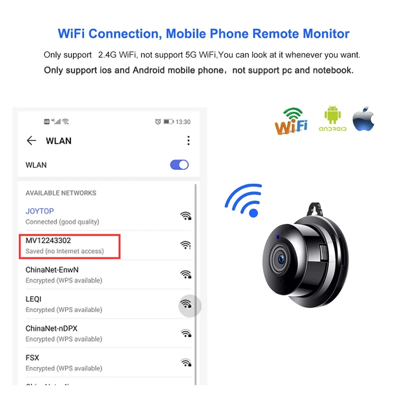 Особенности: 1. Поддержка мобильных телефонов Android и iPhone, где бы вы ни находились. 2. Инфракрасное ночное видение, 5-10 метров видно ночью 3,1080 P HD, разрешение-1 мегапиксельное изображение, видео и изображение более четкие и гладкие 4. Двухстороннее аудио, вы можете говорить друг с другом 5. Лучшее дневное ночное видение, оно будет меняться от дня до ночи автоматически Описание: Дополнительный светильник для объектива обеспечивает дополнительный светильник для объектива. Отличное ночное видение, четкое качество изображения. Параметры: Материал: АБС-пластик Цвет: черный Ночное видение: до 15 м Применение: iOS и Android мобильный телефон Разрешение видео: HD:1920*1080 Поддержка 2,4G wifi, не поддерживает 5G Посылка список: 1 х IP Камера 1 х USB кабель (без адаптера питания) Руководство пользователя (1 шт.) 1 х упаковочная коробка (Есть два вида упаковочных коробок, Случайная Доставка)