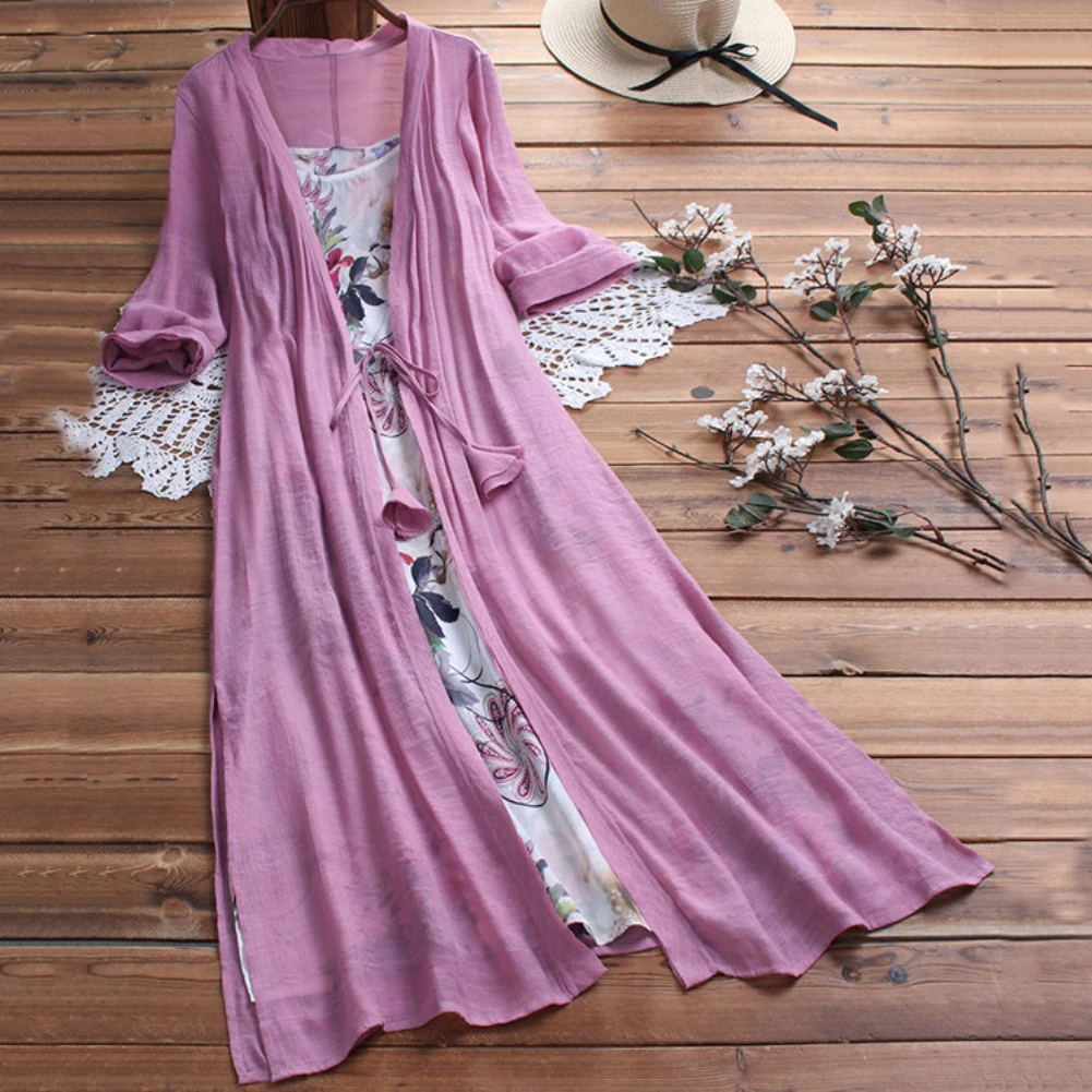 2 шт./комплект размера плюс, женское хлопковое льняное платье без рукавов с цветочным принтом и кардиганом