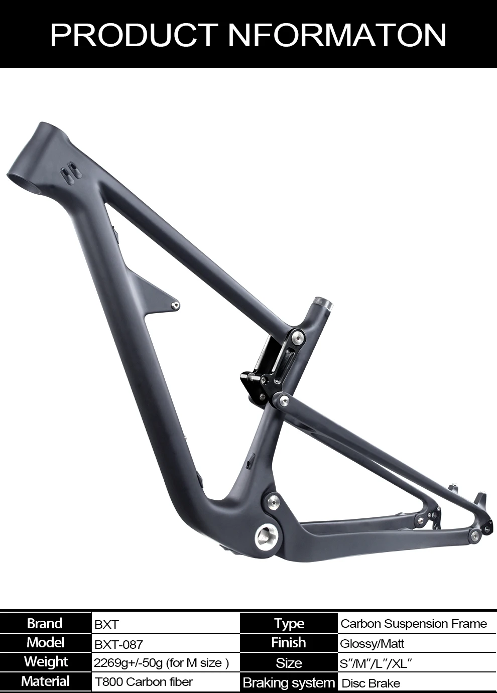 Материал: углеродное волокно T800 Модель: BXT-MTB-087 Ткань: UD Размер: S/M/L/XL Перемещение рамы: 140 мм Размер колеса: 29er * 2,3 Задний амортизатор: 194*46 мм Тип тормоза: 160 мм дисковый тормоз Вес: 2269 +/-50 г (для размера M) Нижний Кронштейн: BSA (73 мм) Задний дептор: 29er: 142*12 мм или 148*12 мм Трубка гарнитуры: 1 1/8-1 1/2, коническая Трубка сиденья: 31,6 мм Зажим: 34,9 мм Максимальная шина: 2,3 "(142*12 мм)/2,35" (148*12 мм)